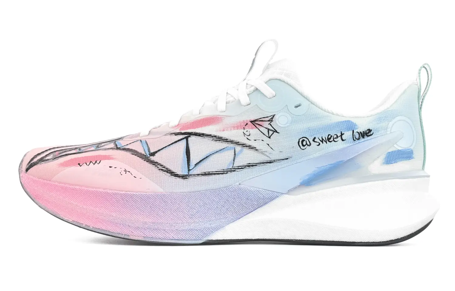 Эти кроссовки созданы на основе оригинальных мужских беговых кроссовок LiNing Chitu 8 PRO (стандартный белый, код товара ARPV003-1, Team1453 - Paper Kite Sweetheart) - профессиональных тренировочных кроссовок для подготовки к тестам по физической подготовке, вступительным экзаменам в среднюю школу и марафонам. Они обладают амортизацией, противоскользящей конструкцией, износостойкостью, воздухопроницаемостью, лёгкостью и отзывчивостью. Дополнительный код товара - ARPV006-23. Бумажный самолётик на кроссовке напоминает воздушного змея, а фраза «Sweet love» передаёт нежное и романтическое послание, символизируя сердце, полное сладких чувств, свободно парящее по жизни, словно воздушный змей, в погоне за любовью и мечтами.