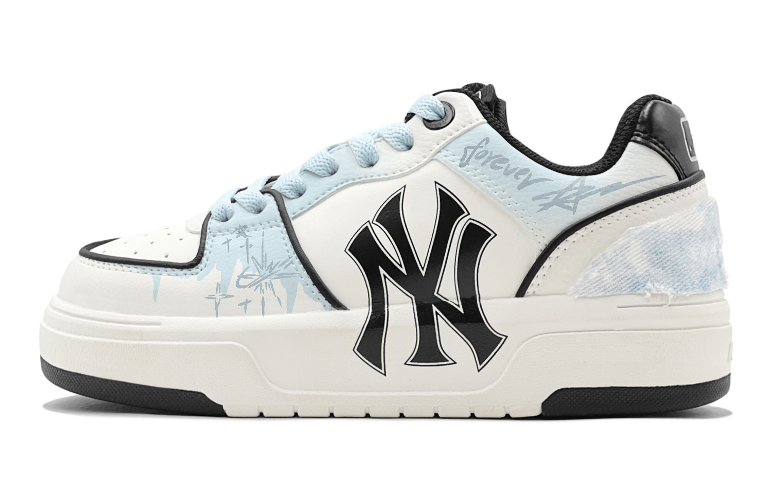 Эти кроссовки, разработанные на заказ, основаны на оригинальной модели унисекс MLB Chunky Liner, 3ASXCA12N-50WHS (дополнительный код товара 3ASXCA12N-50WHS; оригинальный стиль обуви выбирается случайным образом). Кроссовки выполнены в ледяно-голубой цветовой гамме, имеют морозный верх и украшены граффити в виде звёзд, что создаёт простой, но универсальный образ с множеством деталей. В комплект входит лимитированная коробка с обувью.