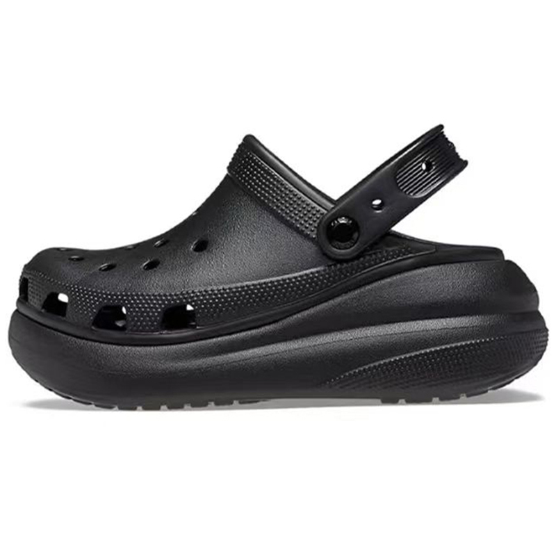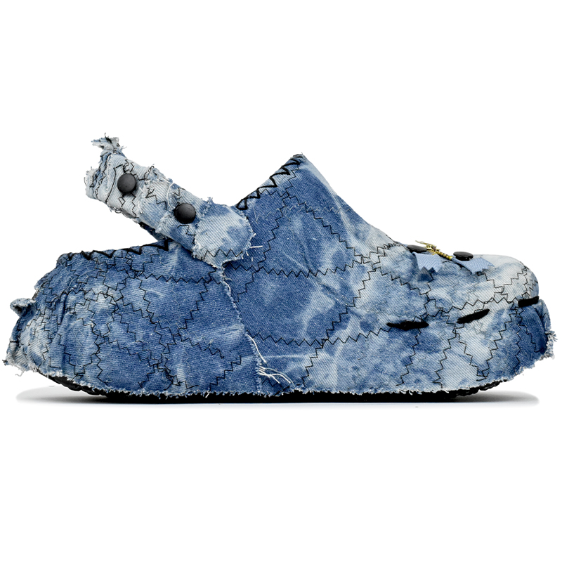 Эти туфли созданы на основе оригинальных спортивных сандалий Crocs Classic Crush, унисекс, чёрного цвета. Они сочетают в себе ретро-стираный деним, бахрому, пэчворк и модные игривые элементы (украшение молниями и пуговицами), демонстрируя самобытный и художественный дизайн.