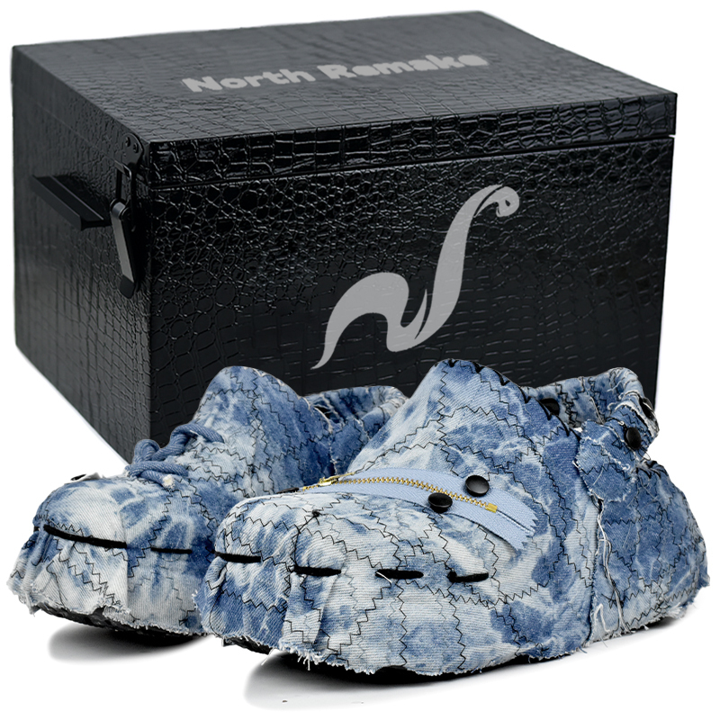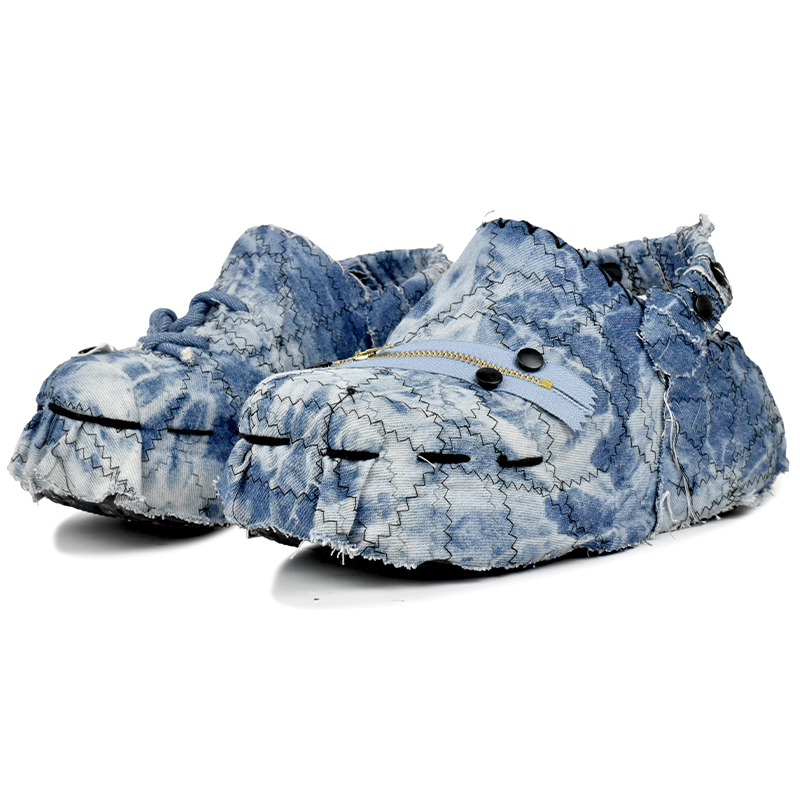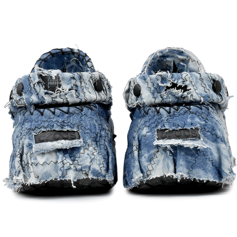 Эти туфли созданы на основе оригинальных спортивных сандалий Crocs Classic Crush, унисекс, чёрного цвета. Они сочетают в себе ретро-стираный деним, бахрому, пэчворк и модные игривые элементы (украшение молниями и пуговицами), демонстрируя самобытный и художественный дизайн.