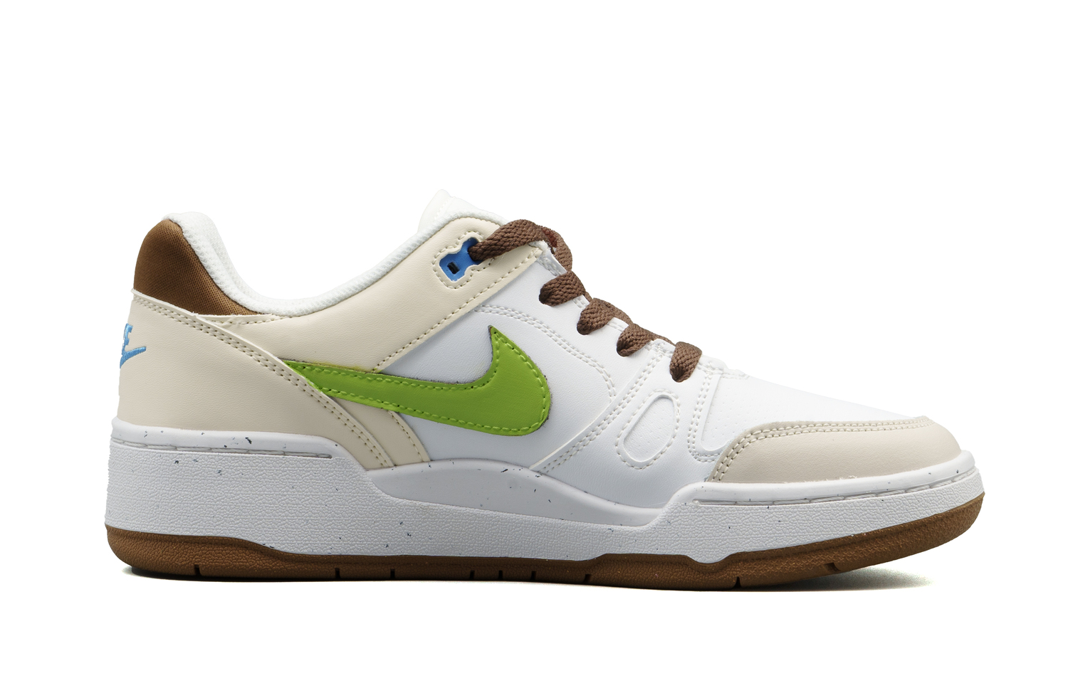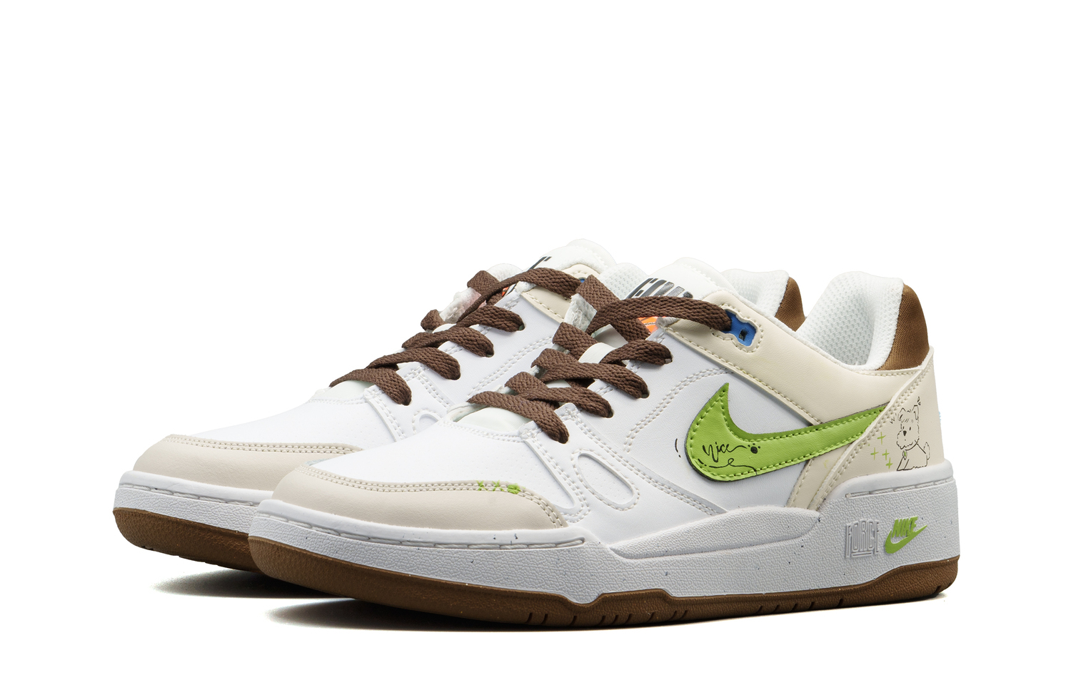 Эти фирменные кроссовки Nike Full Force Low с низким верхом в коричнево-белом цвете отличаются очаровательным дизайном щенка на тему весеннего леса. Они сочетают в себе миловидность щенка с естественной зеленью и тёплыми коричневыми текстурами, создавая двойной стиль «милый + лесной тренд», придавая обуви как целительное, аниме-ощущение, так и свежесть для активного отдыха. - Повествование о цвете и материалах: кремово-белая основа в сочетании с травянисто-зелёным Swoosh, тёплыми коричневыми шнурками и подошвой, образуя цветовую гамму «весенний лес». Яркость травянисто-зелёного, простота тёплого коричневого и мягкость кремово-белого сбалансированы, подчёркивая миловидность элемента IP, передавая естественный и комфортный опыт ношения.