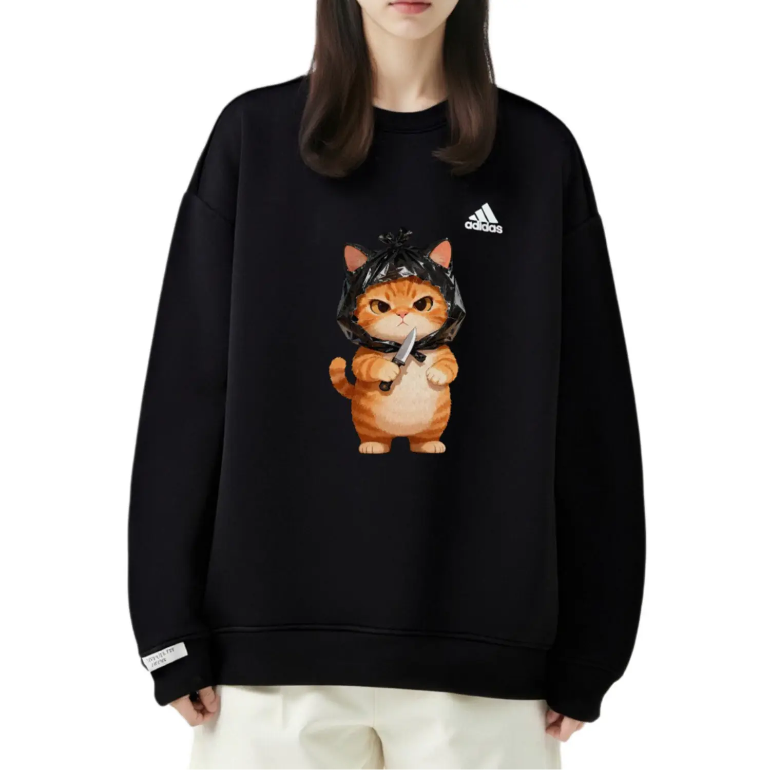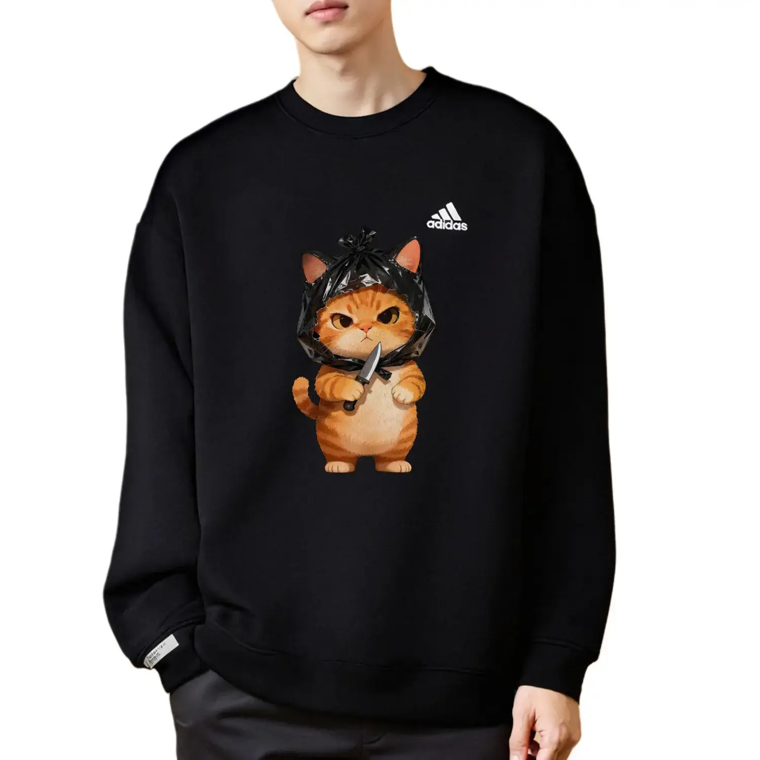 Этот сшитый на заказ предмет одежды выполнен из оригинальной толстовки с длинными рукавами и принтом логотипа adidas LABEL, унисекс, чёрного цвета. Дизайн вдохновлён контрастным очарованием милого рыжего кота и тёмными, необычными элементами, представляя модный и индивидуальный стиль через игривые иллюстрации. Все узоры на этом сшитом на заказ изделии наносятся вручную, и расположение узора может незначительно отличаться на разных изделиях. В связи с особенностями процесса и материалов, пожалуйста, избегайте контакта с острыми предметами, длительного замачивания и сушки при высоких температурах.