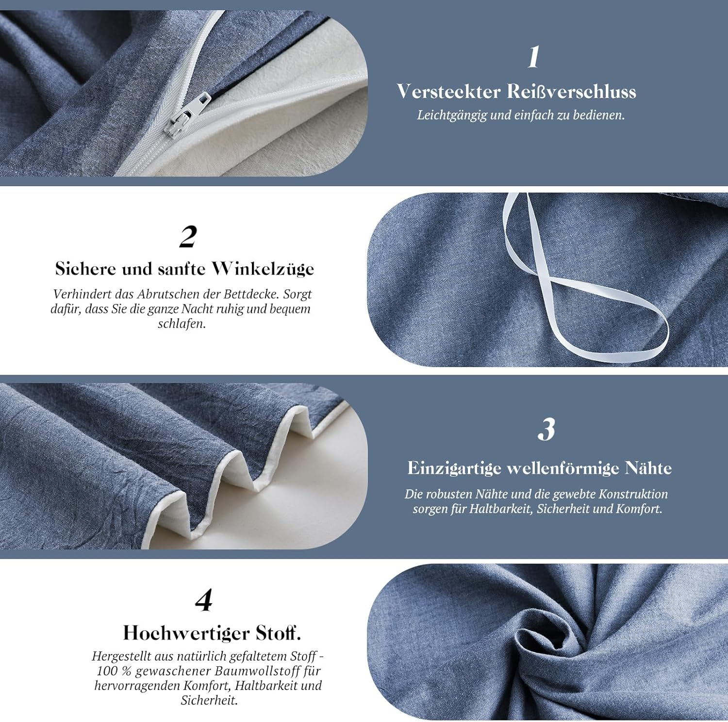 Приятное ощущение на коже: этот комплект постельного белья подвергается «стирке с камнями» (stone washed), чтобы придать ему ощущение, похожее на льняное постельное белье. Будучи таким же дышащим и абсорбирующим, он обеспечивает особенно приятное ощущение на коже в любое время года, даже жаркими летними ночами.