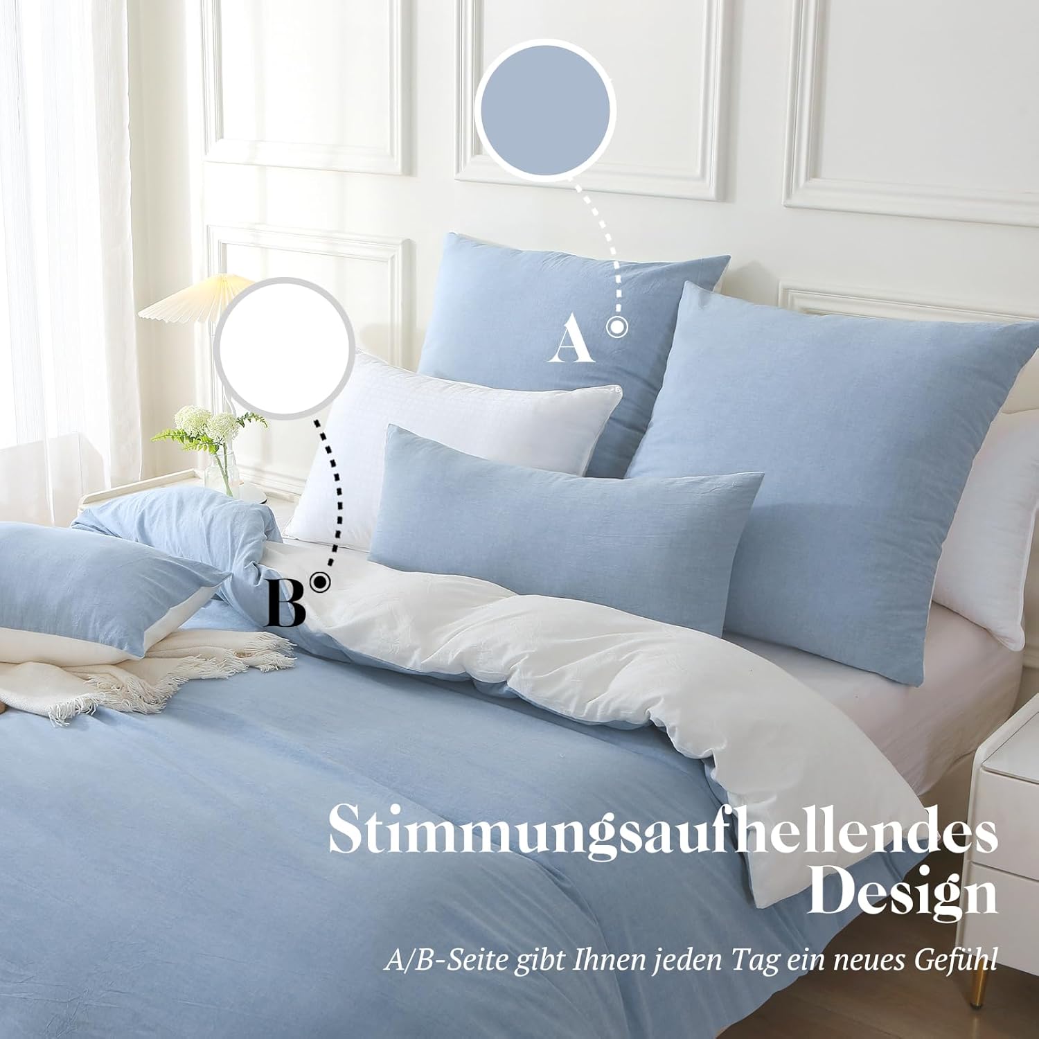 Приятное ощущение на коже: этот комплект постельного белья подвергается «стирке с камнями» (stone washed), чтобы придать ему ощущение, похожее на льняное постельное белье. Будучи таким же дышащим и абсорбирующим, он обеспечивает особенно приятное ощущение на коже в любое время года, даже жаркими летними ночами.