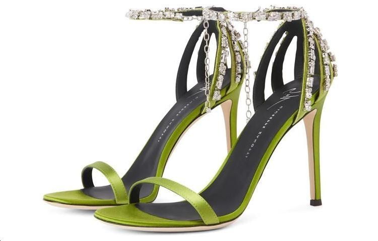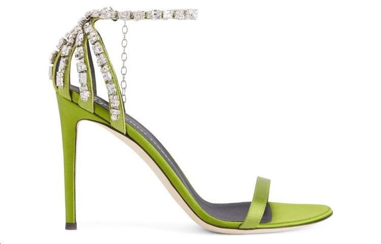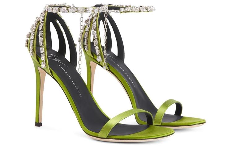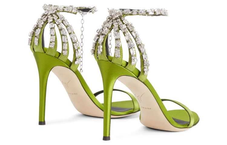 Босоножки изготовлены из атласа и замши кислотно-зеленого цвета, с яркими металлическими украшениями на каблуке, украшенными хрустальными стразами, и поставляются с подходящим ремешком на щиколотке; обхватывающий каблук-шпилька и кожаная подошва дополняют дизайн.