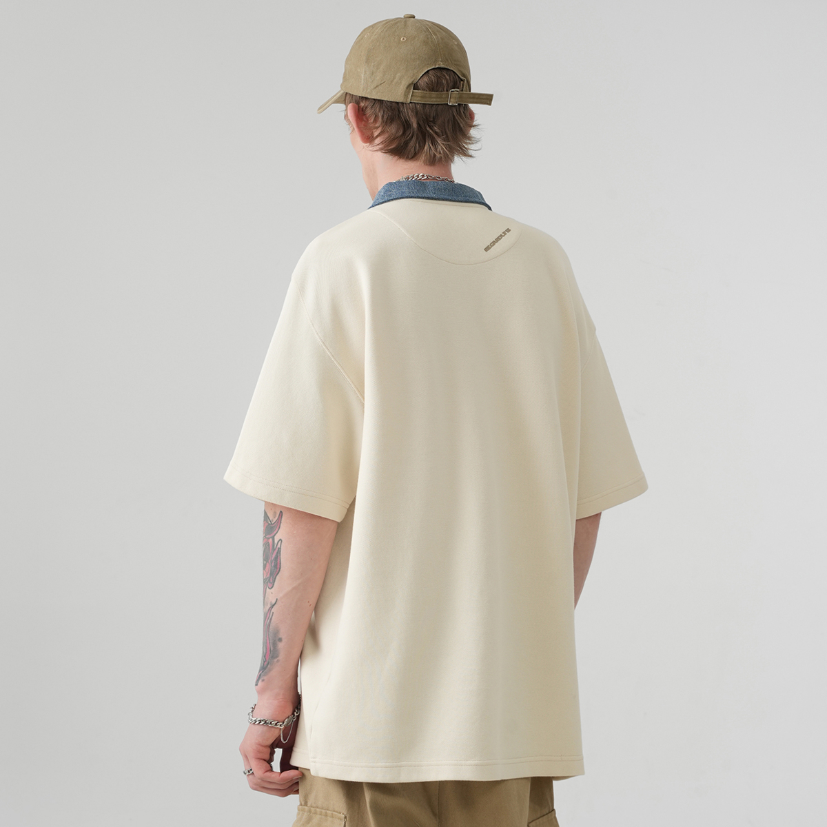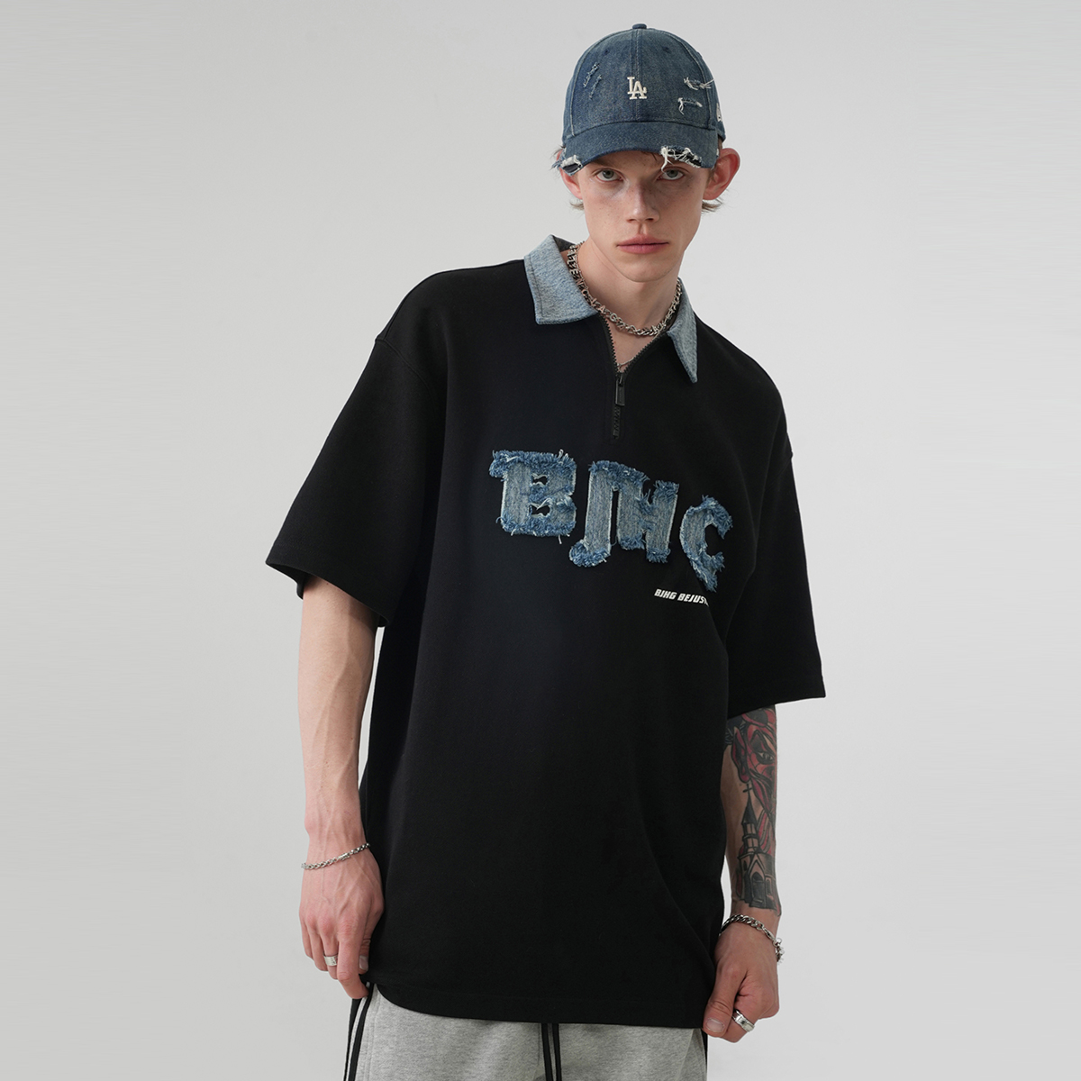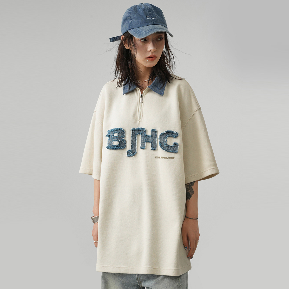 Оригинальный логотип BJHG, вышитый на груди с отделкой из бахромы из денима, подчёркивает узнаваемость бренда. Деконструированные панели на вырезе и спине подчёркивают многослойность изделия. Свободный крой oversize со спущенным плечом подходит для всех типов фигуры, предлагая большую универсальность и разнообразие стилей. Изготовленный из высококачественного плотного пике-хлопка плотностью 280 г, он приятен на ощупь, дышащий, влагоотводящий и мягкий на ощупь, обеспечивая комфортную посадку.