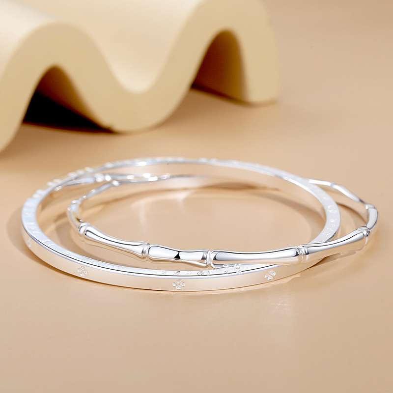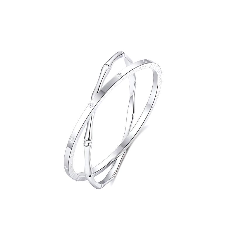 Серебряно-белый браслет Alloy Bangles VANA, Bamboo X Four-Leaf Clover Double Loop Bracelet Solid Closed Style