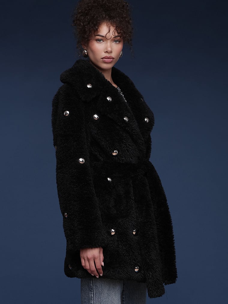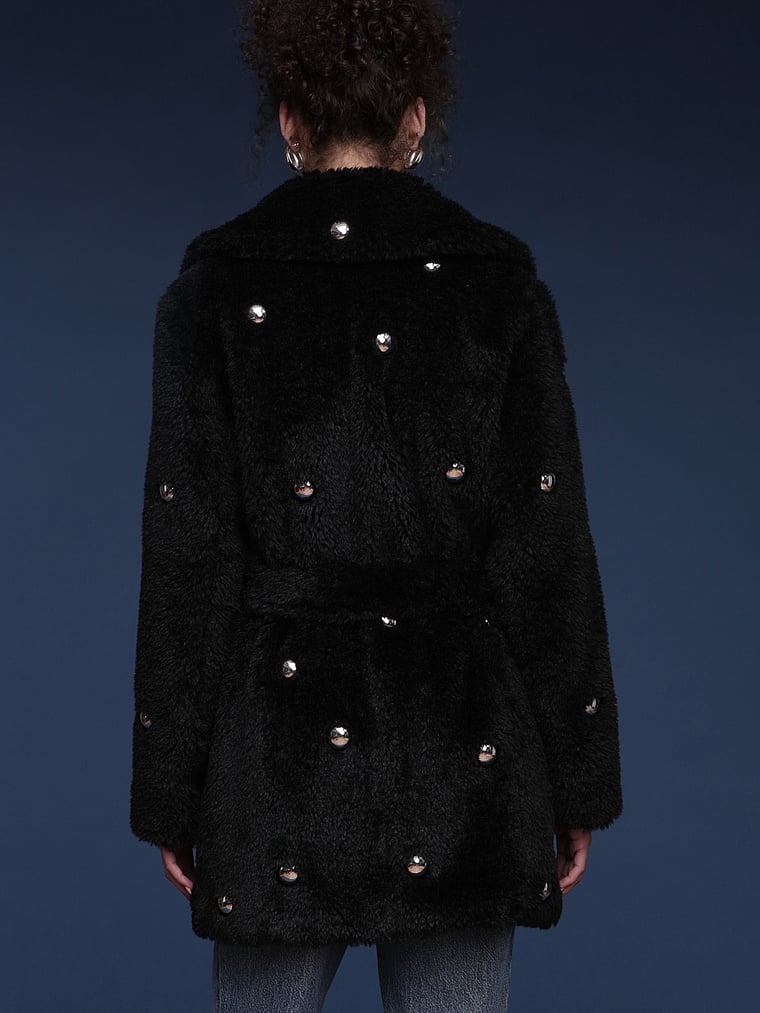 Для прогулок по шикарным городским улицам или импровизированных ночных свиданий под звездным небом. Это пальто, сочетающее в себе декадентскую мягкость и строгий покрой, выполнено из плюшевой искусственной овчины и имеет фигурный воротник с вырезом. Завязывающийся пояс обеспечивает регулируемую посадку, а золотые заклепки придают образу изысканности.