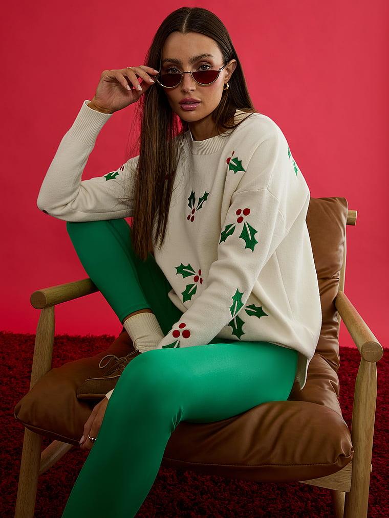 Этот свитер с уютным трикотажным полотном, ребристой отделкой и праздничным дизайном станет незаменимой одеждой для веселого настроения.