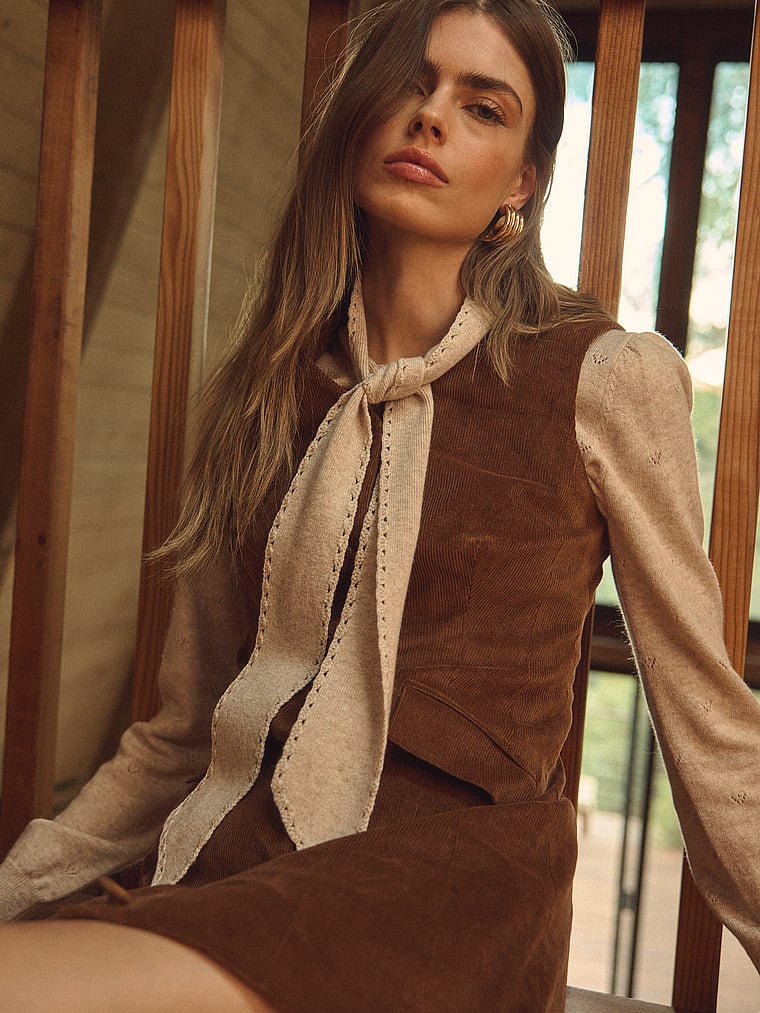 Этот уютный женственный свитер отличается воротником-шарфом и слегка присборенными рукавами, что придает ему изысканный вид.
