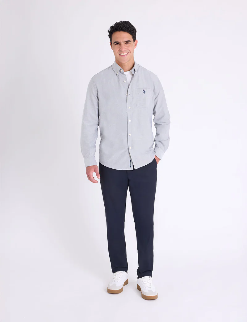 Рубашка Oxford с длинным рукавом Stretch от US Polo Assn. выглядит изысканно и в то же время гибко благодаря хлопковой смеси с добавлением эластичности. Рубашка изготовлена из 58% хлопка, 39% полиэстера и 3% спандекса. Она имеет классический воротник, застёжку на пуговицы спереди и закруглённый край рубашки для удобства сочетания с другими вещами. Накладной карман на левой груди с небольшим вышитым логотипом US Polo Assn. добавляет аутентичности бренду. На модели размер M.