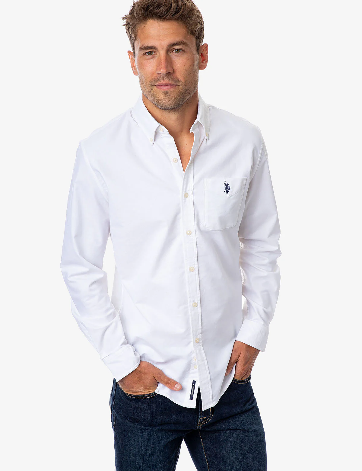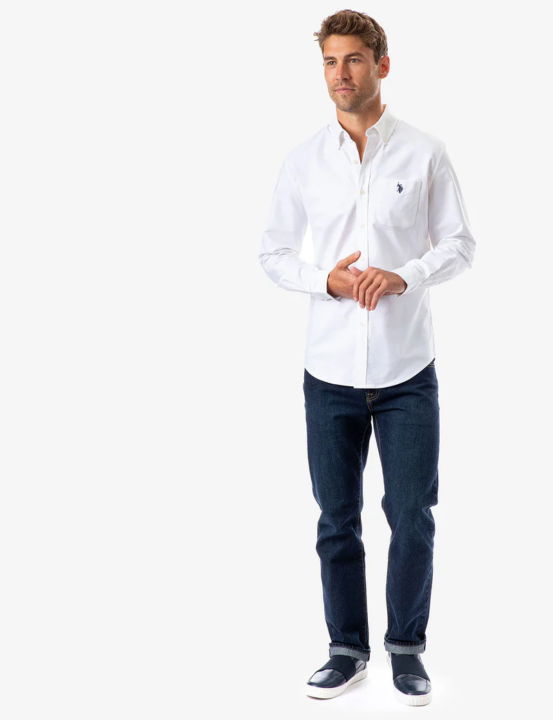 Рубашка Oxford с длинным рукавом Stretch от US Polo Assn. выглядит изысканно и в то же время гибко благодаря хлопковой смеси с добавлением эластичности. Рубашка изготовлена из 58% хлопка, 39% полиэстера и 3% спандекса. Она имеет классический воротник, застёжку на пуговицы спереди и закруглённый край рубашки для удобства сочетания с другими вещами. Накладной карман на левой груди с небольшим вышитым логотипом US Polo Assn. добавляет аутентичности бренду. На модели размер M.