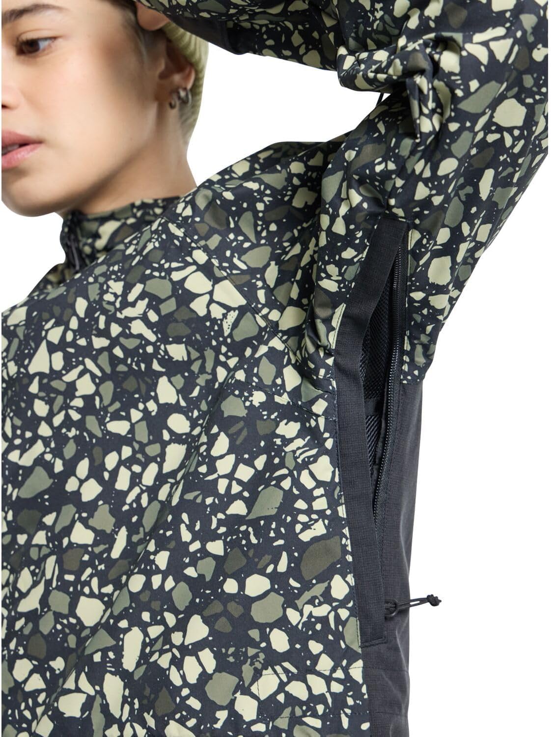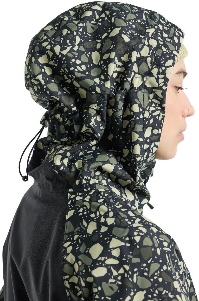 Пришитый капюшон с регулировкой спереди и сзади для защиты. Сетчатые вентиляционные отверстия Pit Zip, не застревающие. Затягивается шнурком на талии.