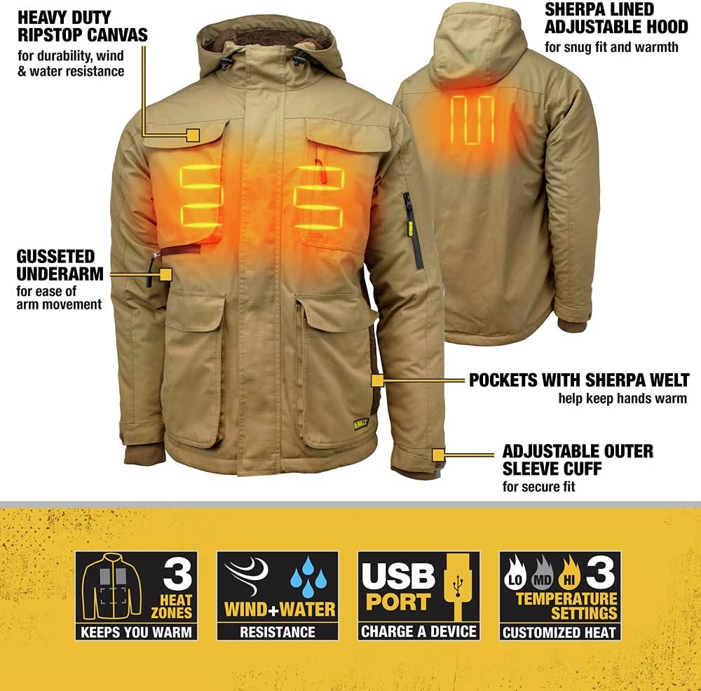 Мужская куртка DEWALT DCHJ091 из прочной ткани Ripstop с подогревом обеспечит многочасовое тепло благодаря 3 зонам нагрева и 3 температурным режимам. Внешний слой Ripstop и подкладка из флиса Sherpa обеспечивают тепло и защиту от холода. Карманы с клапанами на кнопках, молниями и водонепроницаемыми молниями надежно защитят инструменты и аксессуары, оставляя руки свободными для работы. Куртка доступна в двух вариантах: «Без комплекта» и «Комплект». «Без комплекта» можно использовать с аккумулятором DEWALT 20 В, а «Комплект» включает в себя аккумулятор 20 В и зарядное устройство. Обе версии поставляются с USB-адаптером питания DCB092, который также можно использовать для зарядки аксессуаров.
