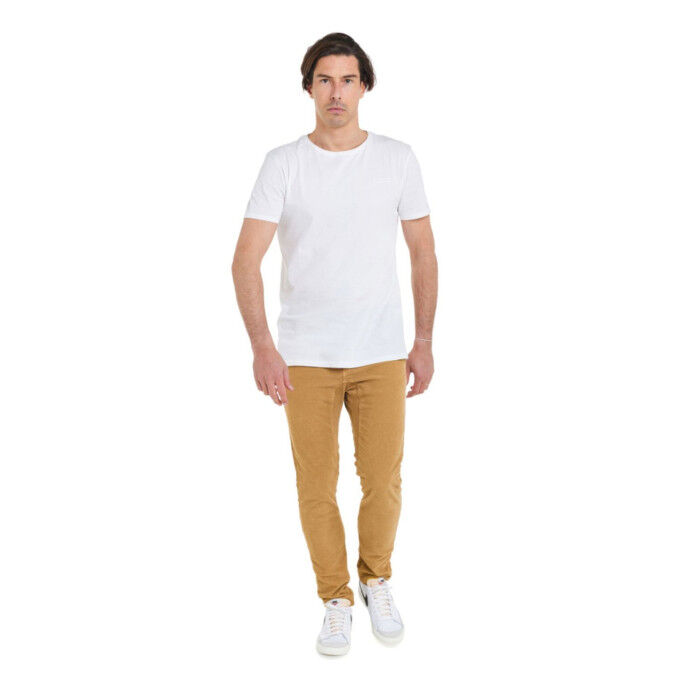 Брюки чинос - обязательная вещь в гардеробе современного мужчины. Эта версия из бежевого вельвета придает им новую динамику, больше структуры и дополнительное тепло благодаря втягивающейся детали. Приталенный крой подчеркивает любую фигуру и обеспечивает естественную свободу движений. В сочетании с кроссовками или кожаными ботинками они адаптируются к вашему стилю, никогда не выглядя неуместно.