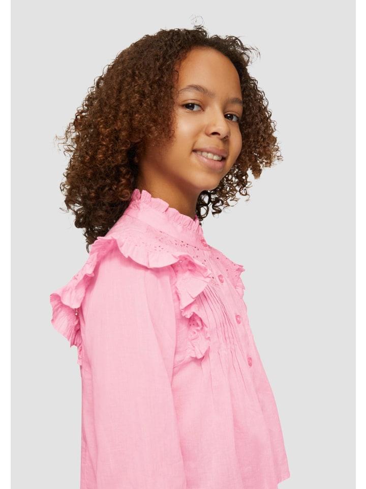 Игривая и воздушная: эта укороченная блузка с ажурной вышивкой и оборками очарует юных модниц. Изготовленная из чистого хлопка, она обеспечивает максимальный комфорт как на каждый день, так и для особых случаев. Круглый вырез и планка с пуговицами позволяют легко надевать и снимать блузку. Идеально подходит для летних образов или в качестве многослойного элемента одежды осенью.