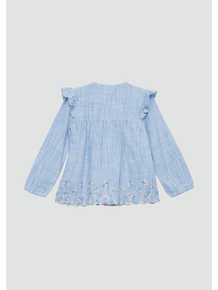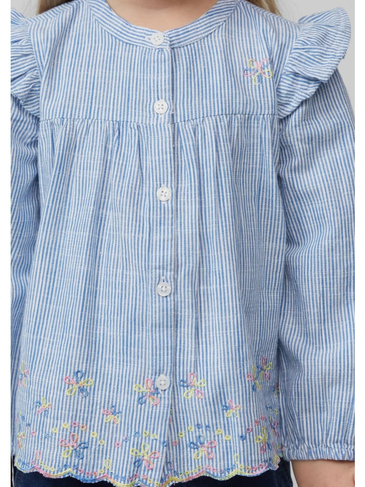 Полосатая хлопковая блузка с игривыми оборками и милой вышивкой для вашего ребенка. А-силуэт обеспечивает свободу движений, а планка на пуговицах позволяет легко надевать и снимать. Очаровательный наряд для школы и отдыха.