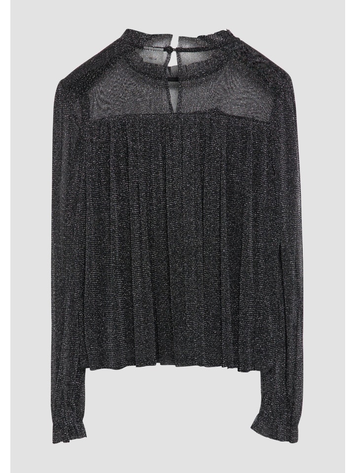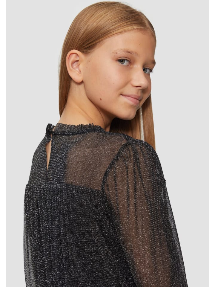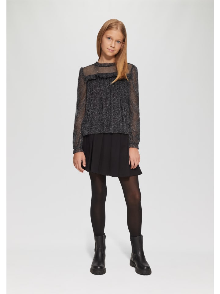 Искрящаяся элегантность для юных модниц! Эта расклешенная сетчатая блузка с оборкой на воротнике очаровывает своим мерцающим блеском. Идеально подходит для праздников или особых случаев. А-силуэт и необработанный подол обеспечивают свободу движений, а трикотажная подкладка - комфорт. Гламурный must-have для модниц-подростков!