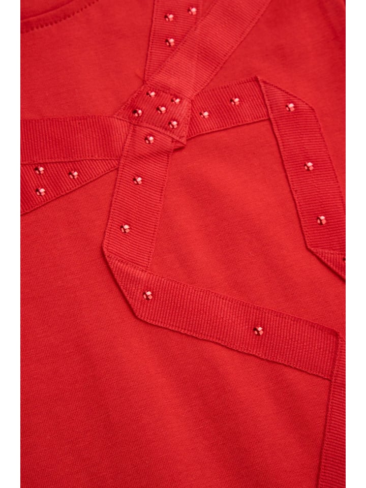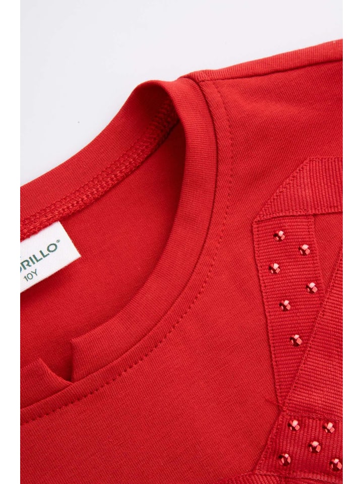 Откройте для себя эту красную блузку с длинными рукавами, которая сочетает в себе элегантность и комфорт. Изготовленная из эластичного, легкого хлопка, она обеспечивает комфортную носку в течение всего дня. Идеально подходит для девочек от 4 до 15 лет. Блузка имеет круглый вырез и изящную отделку спереди. Уникальный принт в виде банта, украшенный изящными стразами, добавляет очарования и делает блузку отличным выбором для различных случаев - от повседневных прогулок до более официальных встреч. Длинные рукава с эластичными манжетами обеспечивают свободу движений и сохраняют тепло. Блузка сертифицирована ECO 5, что гарантирует соответствие самым высоким стандартам безопасности и охраны окружающей среды. Это идеальный выбор для мам, которые ищут качественную одежду для своих детей, заботясь при этом об окружающей среде.