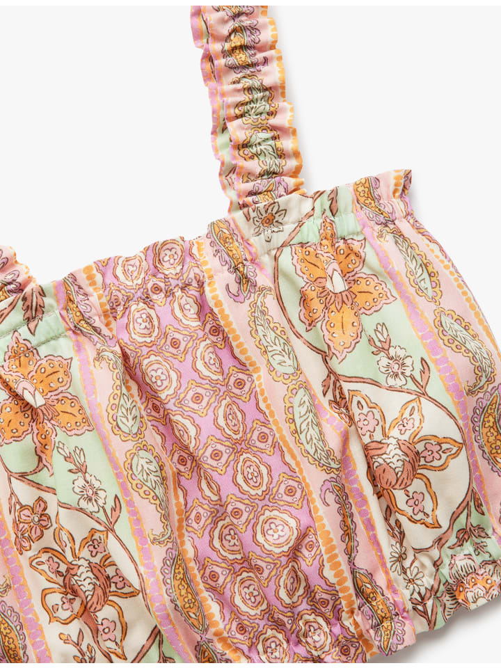 Эта укороченная блузка без рукавов с игривыми оборками стильно смотрится в теплые дни. Квадратный вырез горловины добавляет элегантности дизайну, оживленному цветочным узором. Изготовленная из 100% хлопка, она гарантирует исключительный комфорт и идеально подходит для повседневных случаев.
