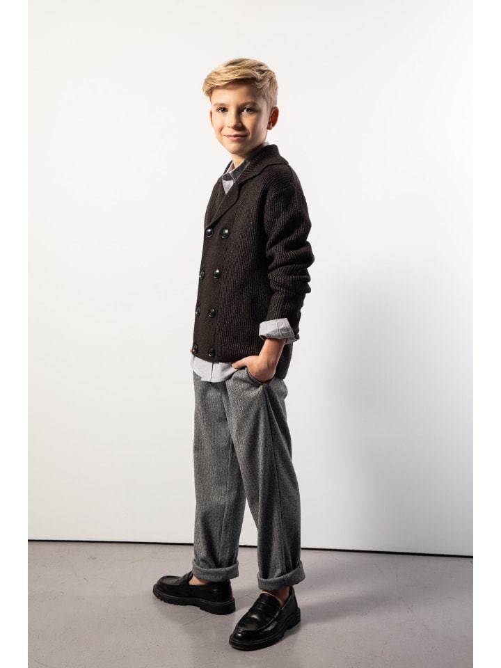 Откройте для себя элегантность и комфорт в сочетании с нашим кардиганом графитового цвета с воротником. Изготовленный из плотной шерсти, он согреет и обеспечит комфорт в прохладные дни. Его классический цвет идеально сочетается с различными нарядами и идеально подходит для особых случаев и повседневных прогулок. Кардиган с длинными рукавами и планкой на пуговицах легко надевать и снимать, добавляя нотку элегантности. Воротник придает ему самобытность и подчеркивает его изысканный вид. Отличный выбор для мальчиков от 4 до 15 лет, которые ценят стиль и комфорт. Благодаря сертификации ECO 5 вы можете быть уверены, что изделие соответствует самым высоким стандартам безопасности и экологичности. Этот кардиган - не только модный аксессуар, но и осознанный выбор заботливых родителей.