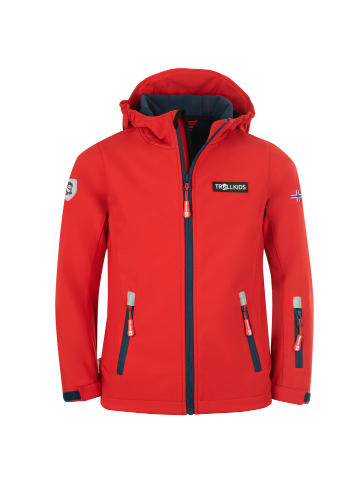 Куртка Softshell с карманом на рукаве и контрастными молниями, водоотталкивающая и ветрозащитная, гибкая и эластичная, уютная и теплая. Незаменимая вещь для межсезонья и занятий, требующих высокой степени свободы движений. Кроме того, она стильно притягивает взгляды! Застежки-липучки на рукавах позволяют регулировать длину рукавов и предотвращают проникновение ветра в манжеты. Светоотражатели расположены спереди и сзади; на плечах изображены норвежский флаг и популярный логотип Lonely Troll из Trollkids. Внешний материал: 100% эластичный полиэстер; подкладка: 100% флисовый полиэстер.