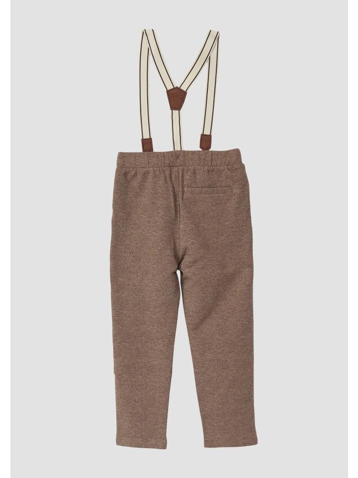 Нарядные брюки с элегантным узором «елочка» и съемными подтяжками. Мягкая ткань прямого кроя обеспечивает свободу движений. Удобный регулируемый пояс и комфортная эластичность. Стильный наряд для особых случаев.