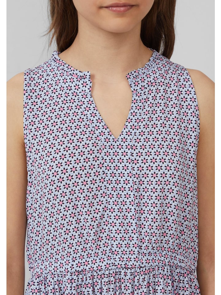 Легкое платье миди из вискозы с игривым гофрированным воротником и V-образным вырезом. Расклешенный крой и красивый узор по всей поверхности делают его идеальным летним спутником. Практичная застежка на пуговицы сзади позволяет легко надевать и снимать платье. Идеально подходит для семейных прогулок или праздников.