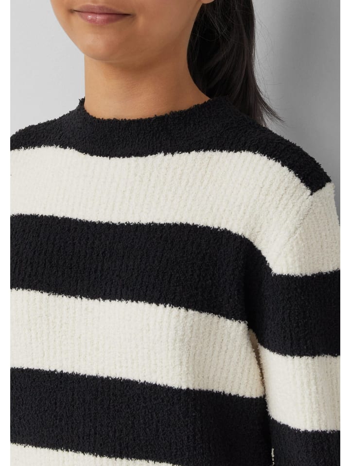 Полосатое трикотажное платье короткой длины с круглым вырезом. Классический крой и ребристые манжеты на рукавах обеспечивают комфорт. Идеально подходит для прохладных дней и универсально - стильный повседневный спутник для вашего ребенка.