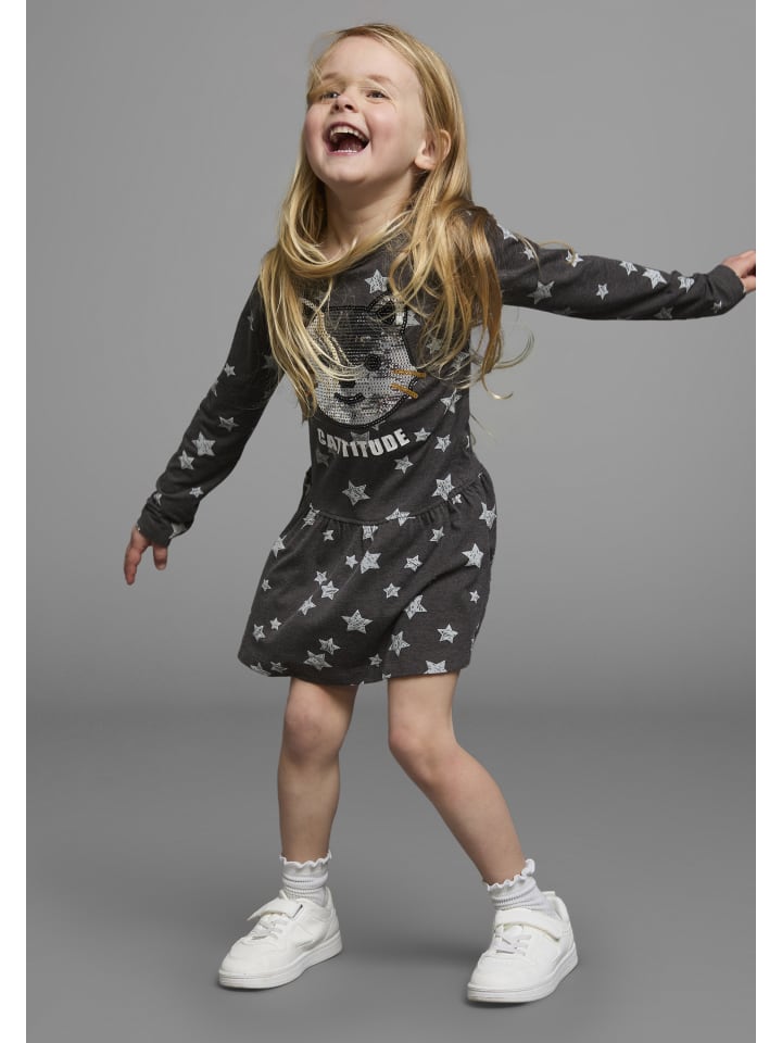 Трикотажное платье с длинными рукавами от KIDSWORLD для девочек со звездным принтом в потертом стиле. Милый рисунок в виде кота с блестками и стильный эффектный принт спереди. Классический крой с круглым вырезом и присборенной расклешенной юбкой. Изготовлено из эластичной ткани.