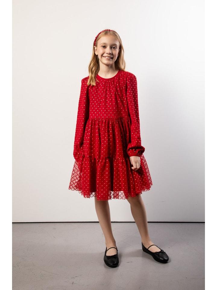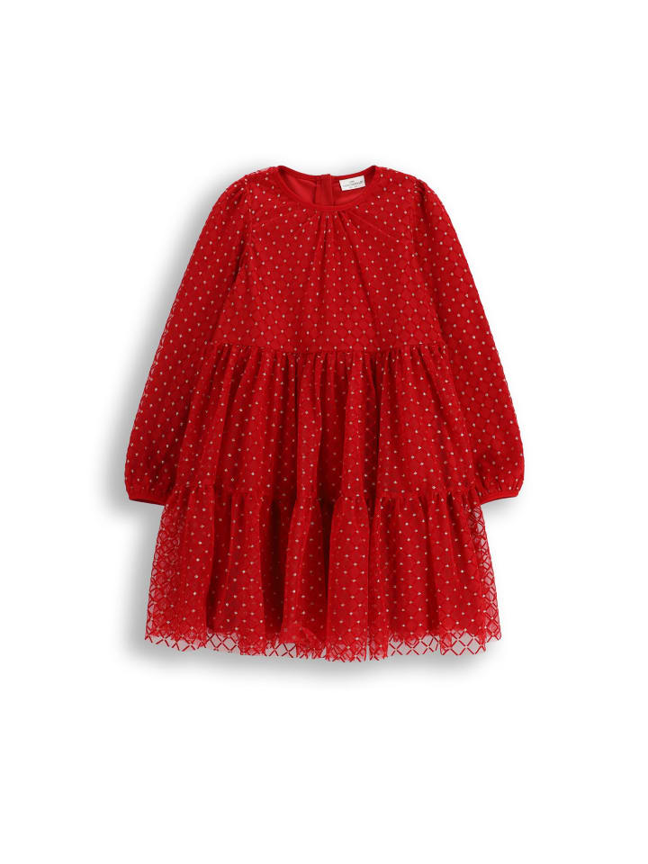 Откройте для себя красное платье из тюля, которое порадует каждую маленькую леди. Яркий цвет и сверкающие украшения делают его идеальным для особых случаев, таких как дни рождения или праздники. Длинные рукава и круглый вырез горловины придают ему классический шарм. Изготовленное из тонкого тюля на хлопковой подкладке, оно обеспечивает комфорт и свободу движений. Сборки добавляют объем и создают потрясающий силуэт, который понравится каждой девочке. Застежка на пуговицы сзади облегчает одевание. Сертификация ECO 5 гарантирует, что платье соответствует самым высоким стандартам безопасности и экологичности. Выбор, сочетающий в себе красоту и ответственность. Подарите своей дочери волшебные мгновения в этом исключительном наряде!