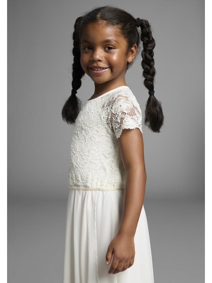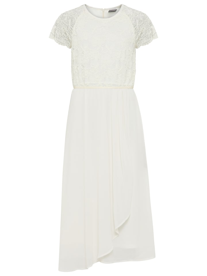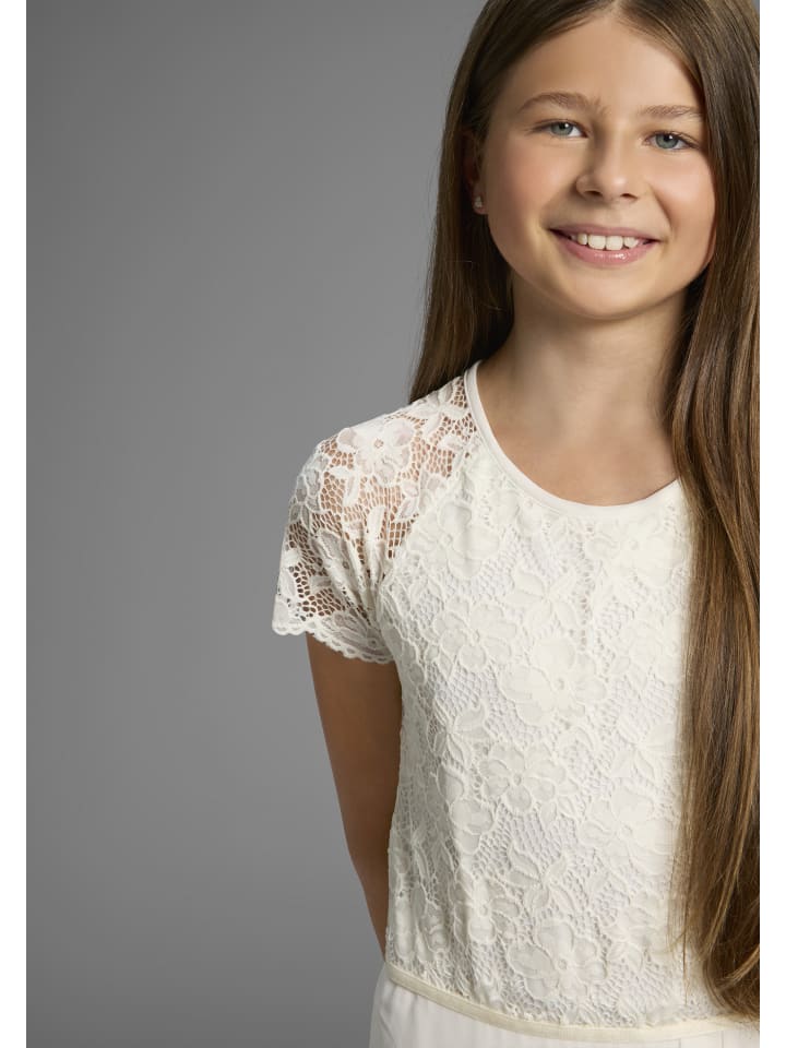 В такой особенный день, как свадьба, идеальное платье просто необходимо: это трикотажное платье от KIDSWORLD создаст прекрасные моменты и воспоминания. Оно имеет расклешенный подол и заканчивается у щиколотки. Нежная кружевная ткань добавит праздничного штриха.