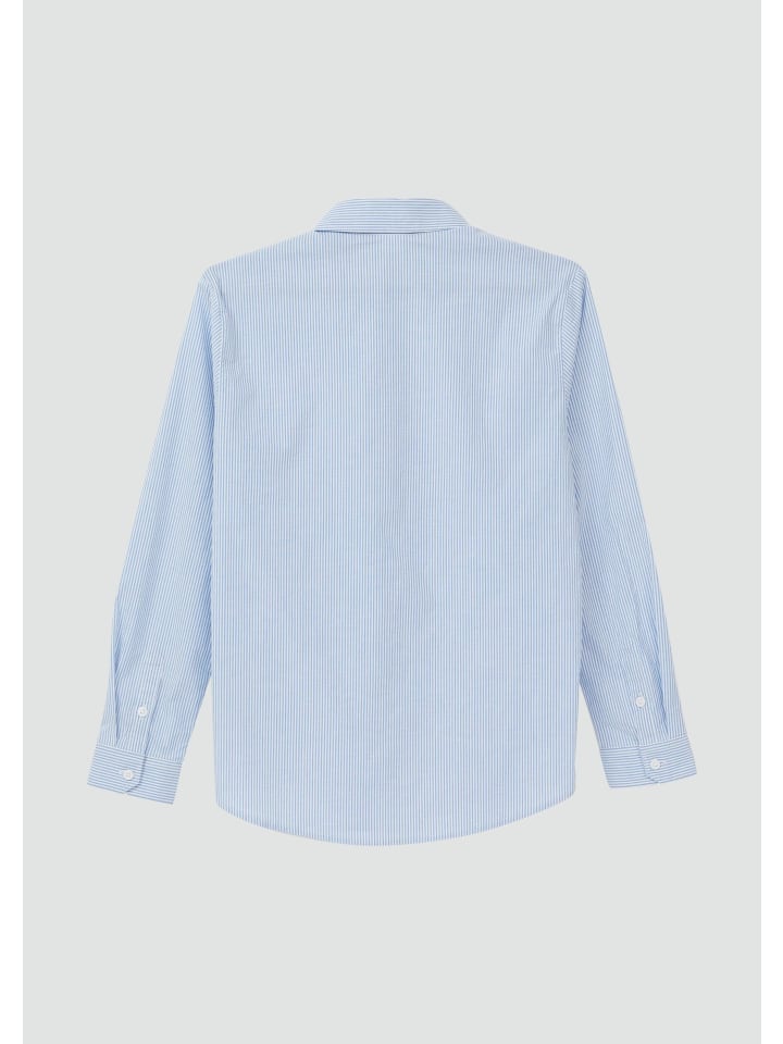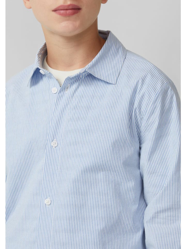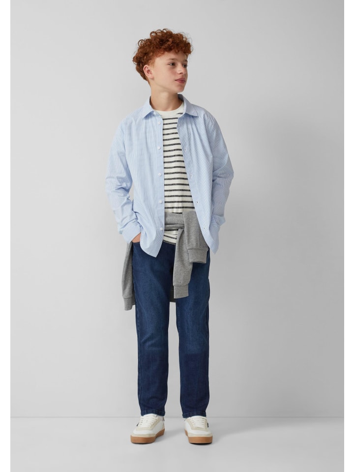 Нарядная рубашка в тонкую полоску: эта рубашка с длинными рукавами из хлопковой смеси станет идеальным дополнением для праздничных случаев. Классический рубашечный воротник и планка на пуговицах придадут вашему ребенку элегантный вид. Благодаря прямому крою и легкой эластичности она обеспечивает свободу движений в течение всего дня.