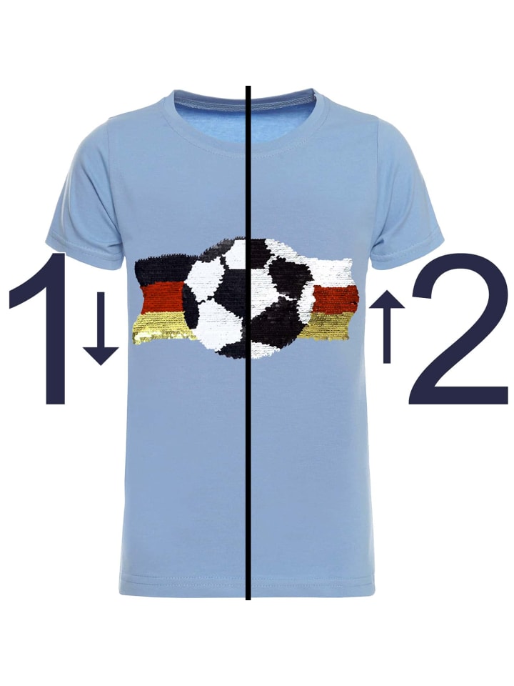 Самая крутая футболка для мальчиков этим футбольным летом! Изготовленная вручную в Турции, эта футболка только что прибыла. Футболка из 95% хлопка и 5% эластана приятна на ощупь, имеет модный крой, короткие рукава и круглый вырез горловины. Главная изюминка: двусторонний футбольный мяч с пайетками и надписью «Germany». Можно стирать в стиральной машине при температуре до 30°C.
