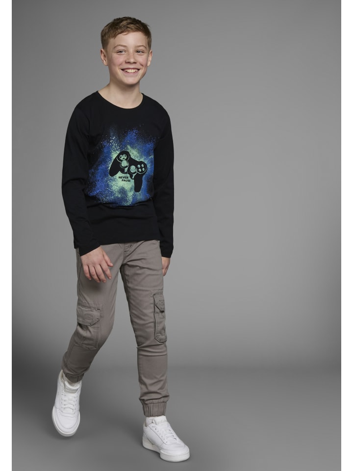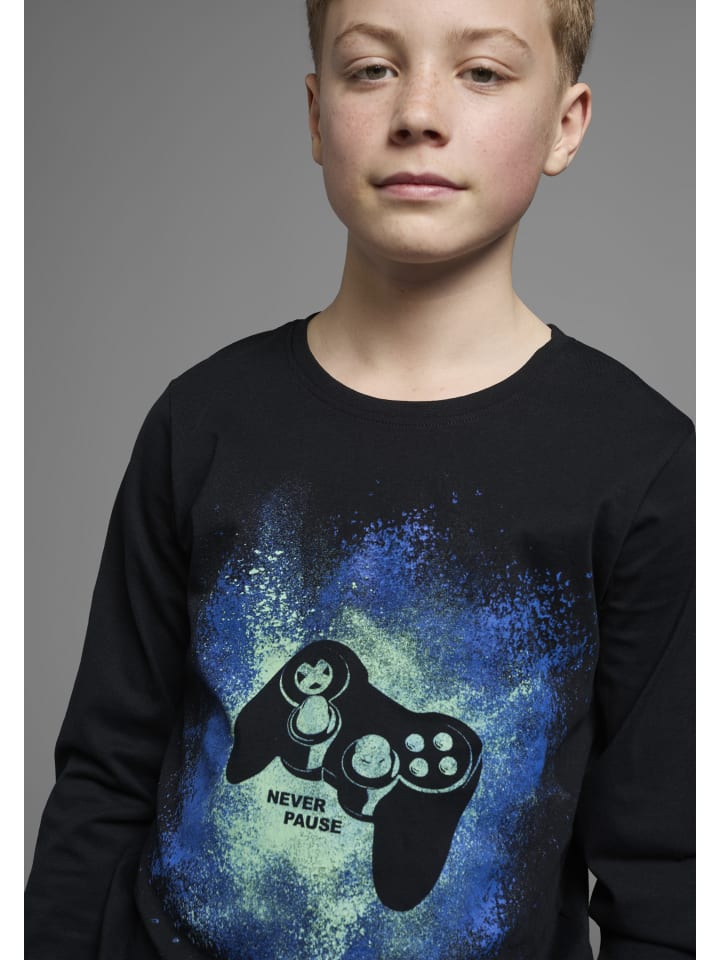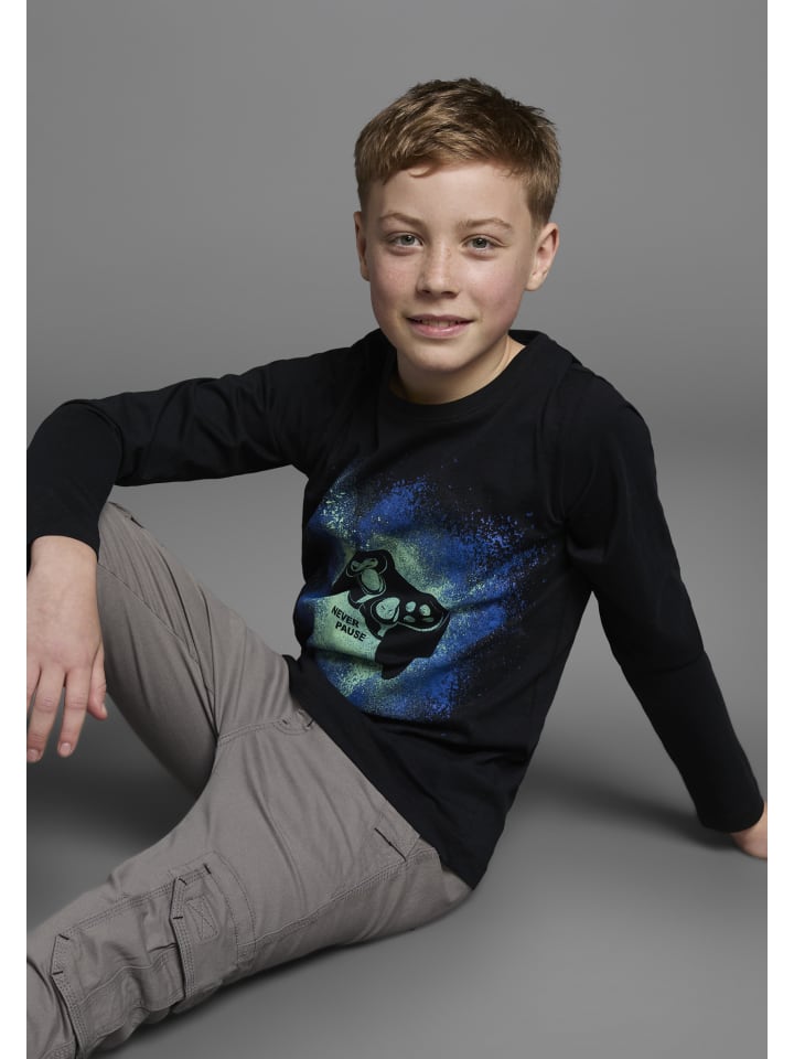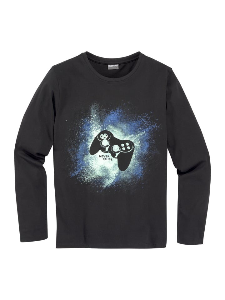 Универсальная рубашка с длинными рукавами от KIDSWORLD с напечатанными акцентами. Она имеет классический крой и круглый вырез горловины в рубчик. Благодаря эластичному трикотажу верх мягко драпируется и обеспечивает комфорт.