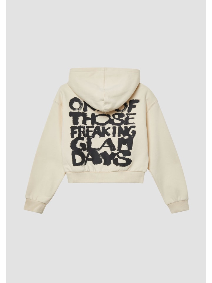 Повседневная свободная толстовка с принтом спереди и сзади. Мягкая ткань толстовки и капюшон на подкладке обеспечивают максимальный комфорт. Укороченный фасон со спущенными плечами и ребристыми манжетами завершает образ.
