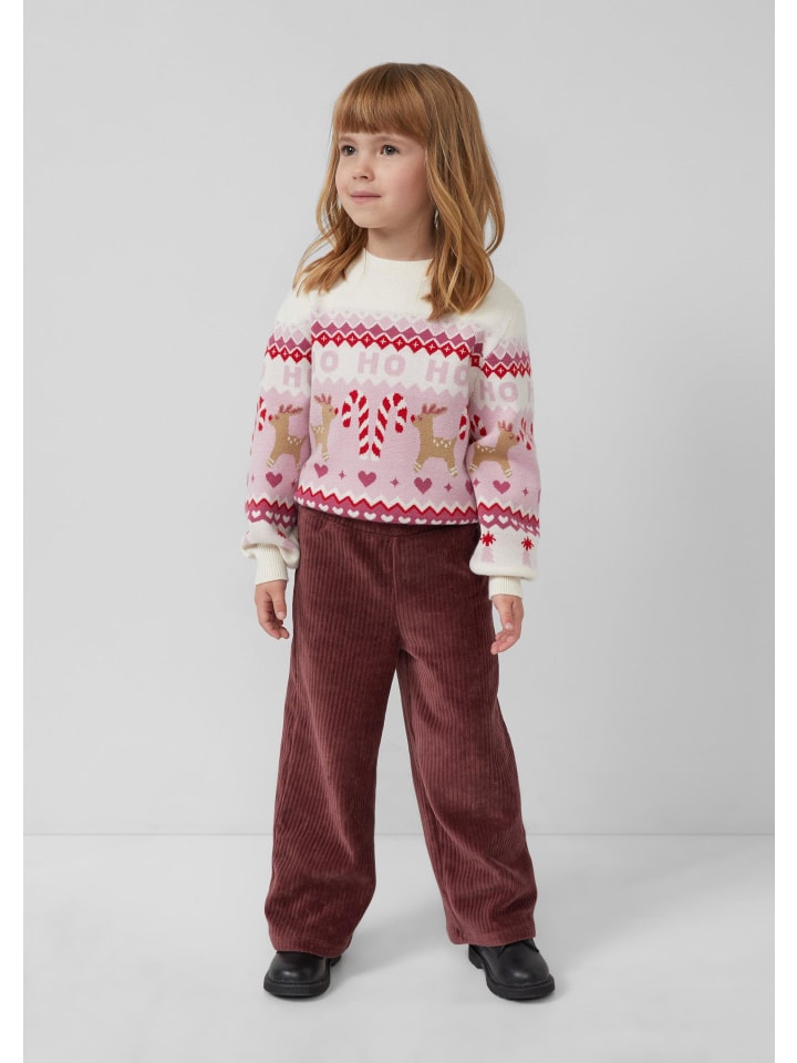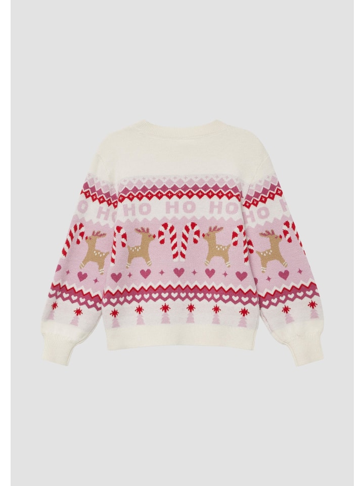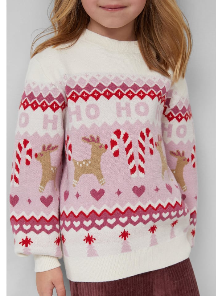 Уютный вязаный свитер свободного кроя с праздничной рождественской интарсией. Мягкая вискозная смесь, а также ребристые манжеты и низ обеспечивают комфортную носку. Широкие рукава и круглый вырез горловины делают этот свитер уютным спутником в рождественский сезон.