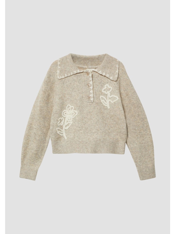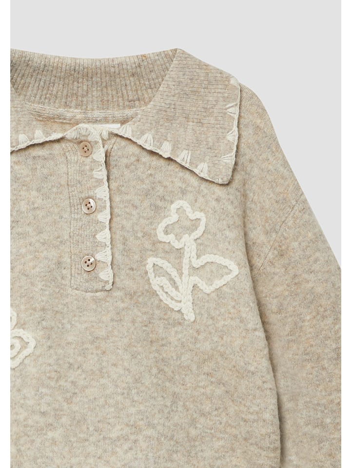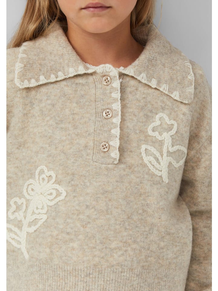 Стильный свитер с воротником-поло и цветочной вышивкой для вашего ребенка. Уютный трикотаж сохраняет тепло и обеспечивает полную свободу движений благодаря свободному крою. Практичная планка на пуговицах и ребристые манжеты позволяют легко надевать и снимать свитер. Универсальный вариант для школы и отдыха.