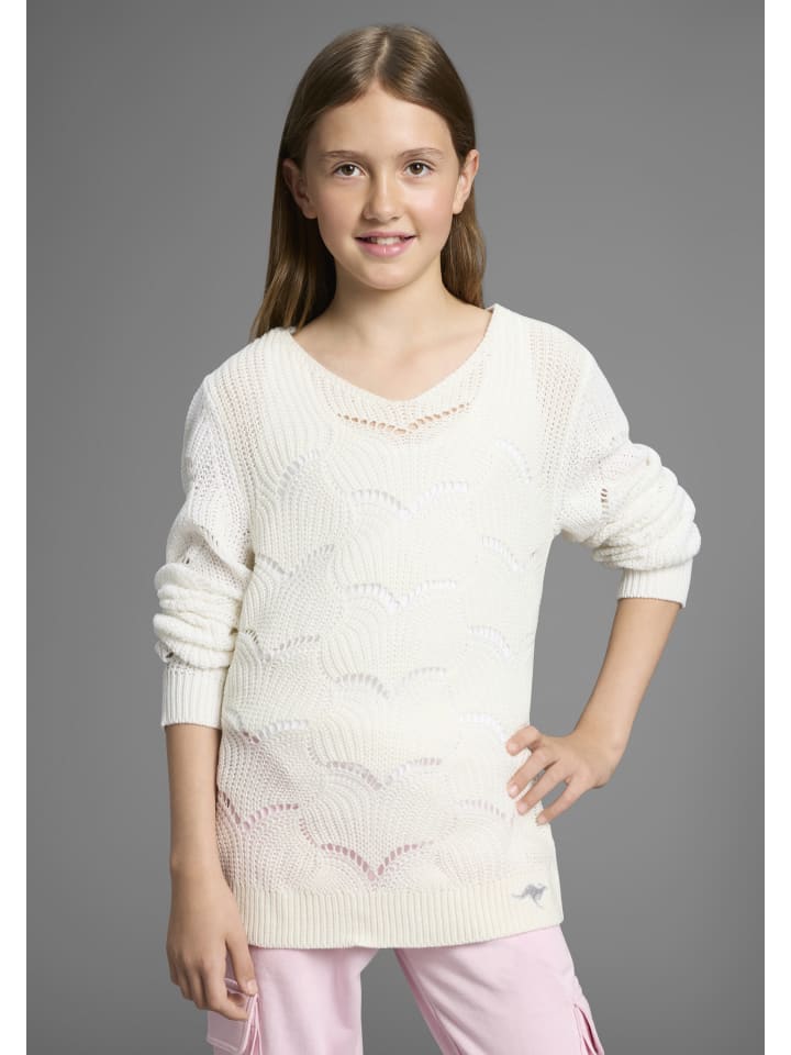 Актуальный вязаный свитер от KangaROOS с ажурным узором. Длина до бедер, стандартная ширина. Длинные рукава. Этот тонкий трикотажный топ теплый и удобный.