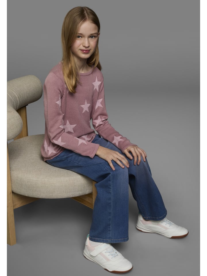 Модный вязаный свитер от KIDSWORLD со звездным узором. Длина до бедер, стандартная ширина. Длинные рукава. Эластичная тонкая вязка позволяет верху двигаться вместе с вами.