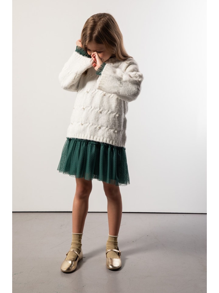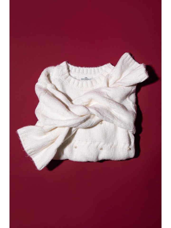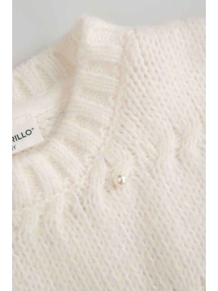 Откройте для себя этот вязаный свитер цвета экрю, идеально подходящий для маленьких модниц. Изготовленный из толстой шерсти, он согреет и обеспечит комфорт в прохладные дни. Круглый вырез и длинные рукава придают классический шарм, а изящная отделка бисером добавит нотку уникальности. Элегантный вязаный свитер для девочек. Этот свитер - идеальный выбор для особых случаев и повседневной носки. Сертификация ECO 5 гарантирует соответствие изделия самым высоким стандартам безопасности и экологичности. Свитер предназначен для девочек в возрасте от 4 до 15 лет, что делает его универсальной одеждой на многие сезоны. Выбирайте этот свитер, чтобы ваш ребенок чувствовал себя комфортно и выглядел стильно в любой ситуации. Он идеально сочетается с элегантными брюками или юбками, создавая гармоничный образ. Подарите своей дочери комфорт и элегантность, которые понравятся вам обеим.