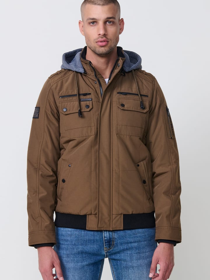 Мужская куртка на подкладке. Воротник с капюшоном. Застежка-молния спереди. Карманы. Состав: 100% полиэстер.
