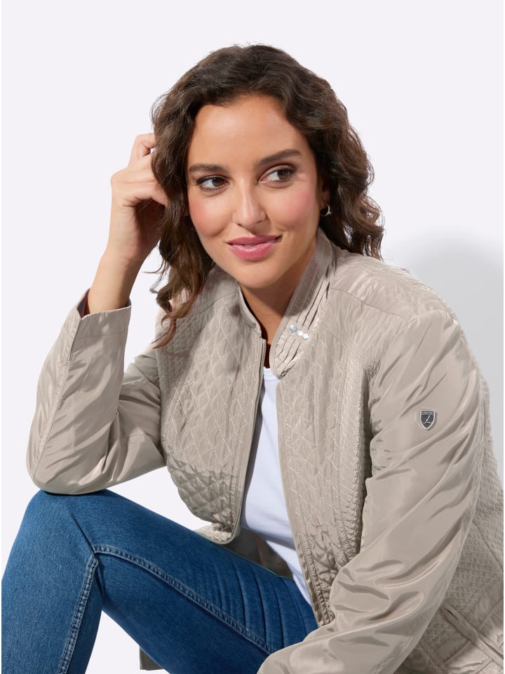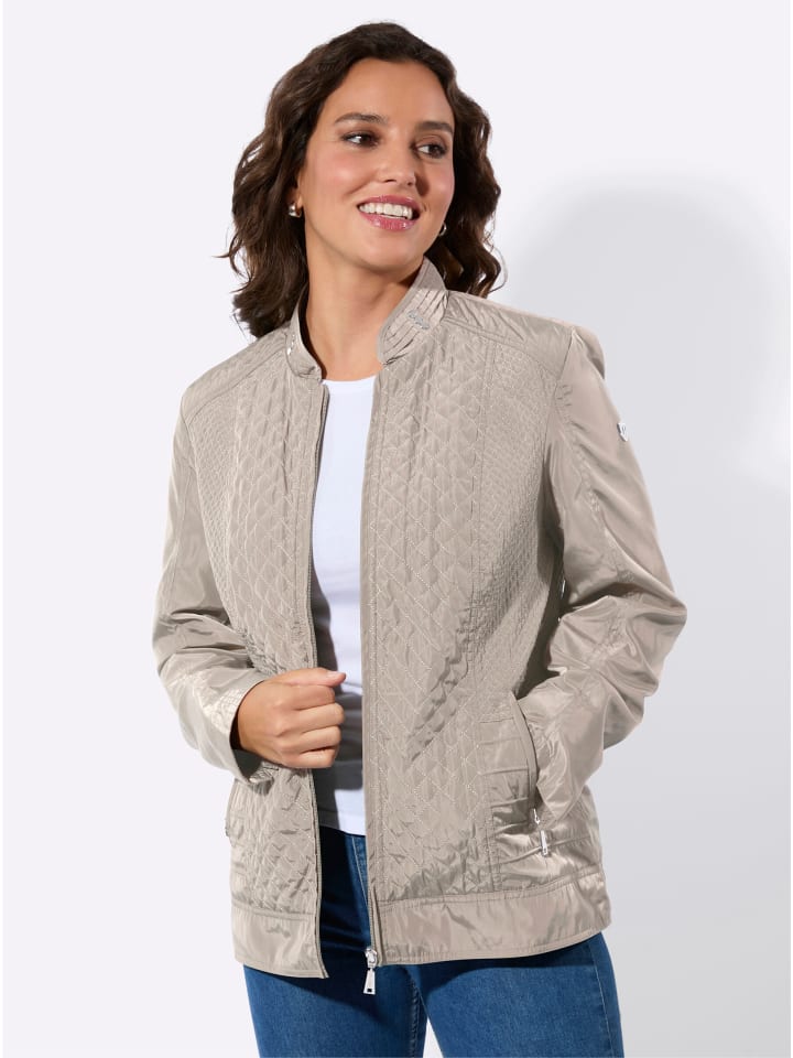 Эта легкая, теплая стеганая куртка станет отличным спутником в межсезонье! Детали: стильный стеганый микс, воротник-стойка с окантовкой, складками и заклепками, длинная молния, длинные гладкие рукава с разрезами на манжетах и два кармана на молнии. Формирующие швы создают привлекательный силуэт.