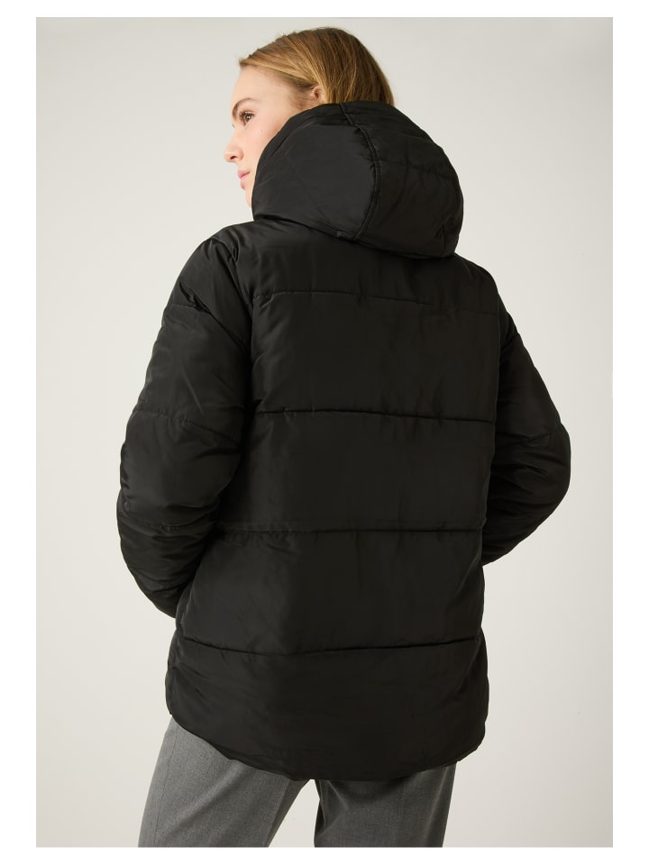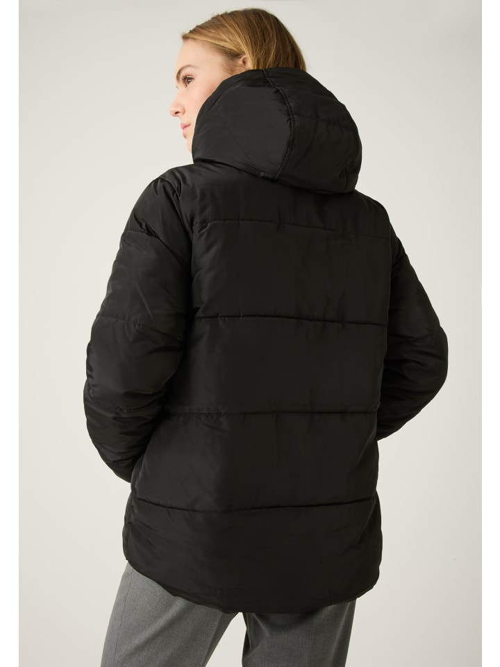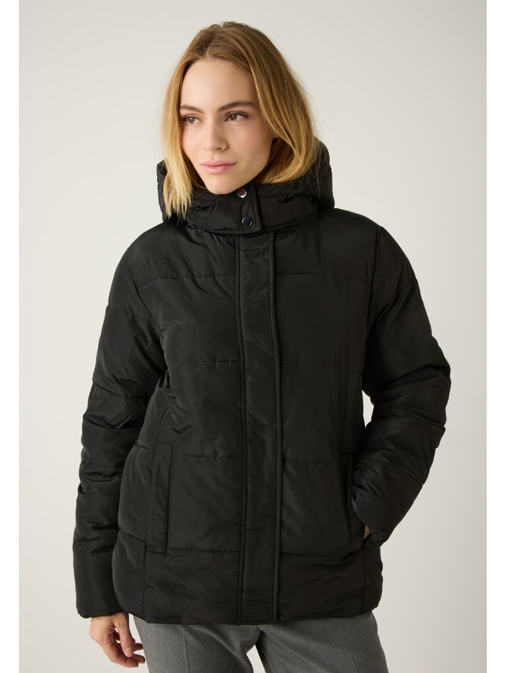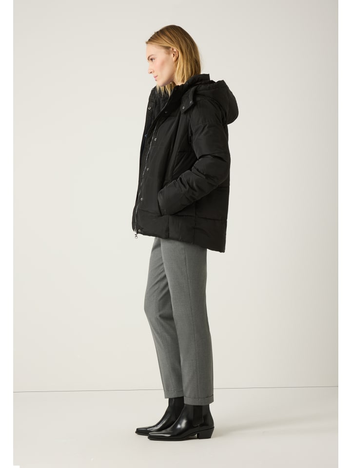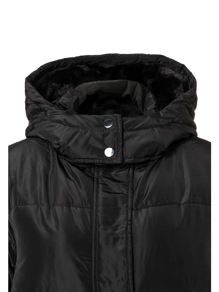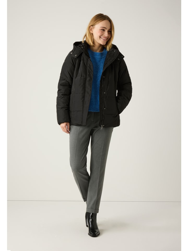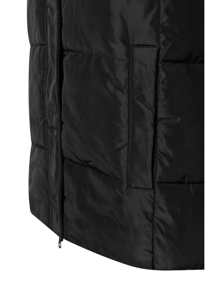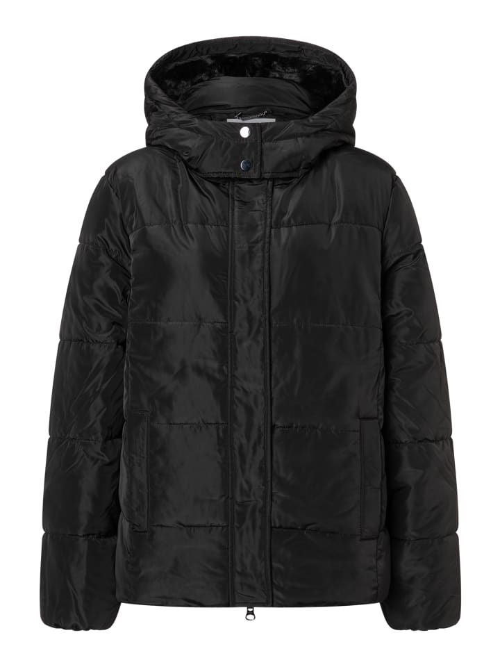Черная стеганая куртка от MORE & MORE - поистине универсальная вещь. Она идеально сочетается как со спортивным джинсовым стилем, так и с классическими деловыми нарядами и станет идеальным спутником в холодные дни. Вшитый капюшон с мягкой черной отделкой из искусственного меха обеспечивает дополнительное тепло и стильный вид.