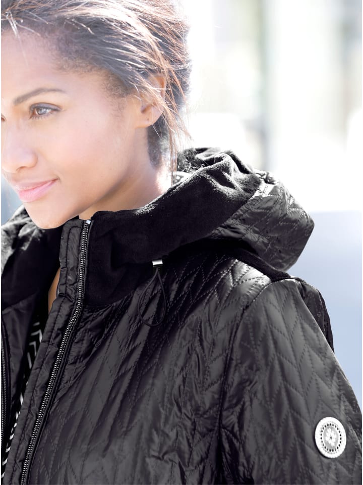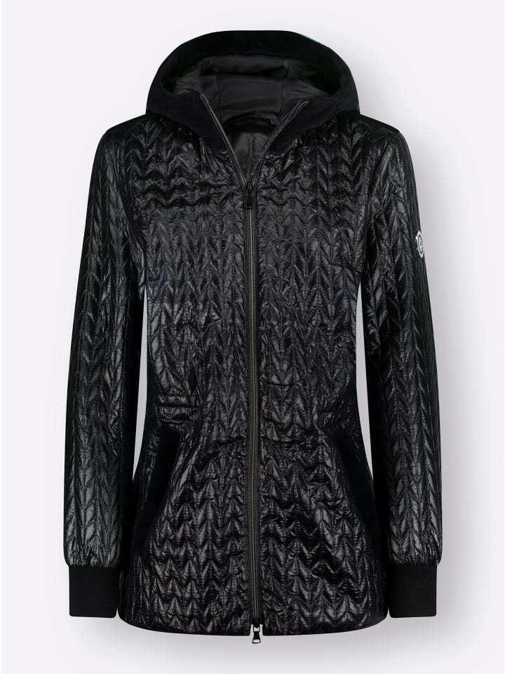 Эта куртка идеально подходит для переменчивой погоды благодаря инновационной зигзагообразной лазерной стежке. Приятно теплая и легкая, она выглядит блестяще благодаря легкому блеску и элегантной бархатной отделке на капюшоне, плечах и двух прорезных карманах с потайными кнопками. Также имеется один внутренний карман на пуговице. Капюшон и талия имеют внутренние эластичные шнурки со стопорами для индивидуальной регулировки размера. Практичная двухсторонняя молния с ветрозащитной планкой обеспечивает удобную посадку. Куртка имеет корректирующие вытачки на груди и эластичные манжеты.