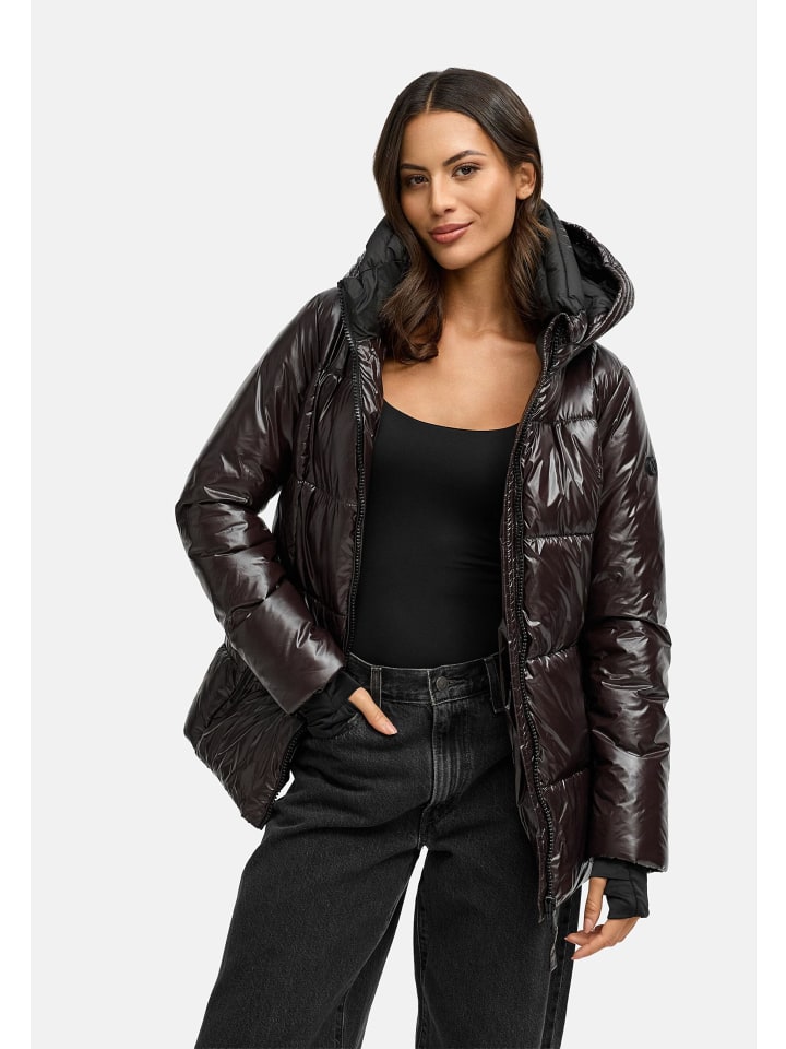 - Блестящая женская стеганая куртка с мягким капюшоном.