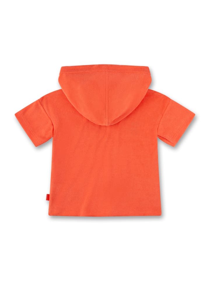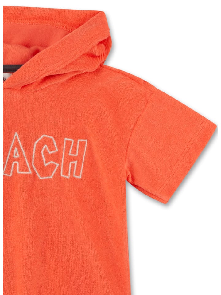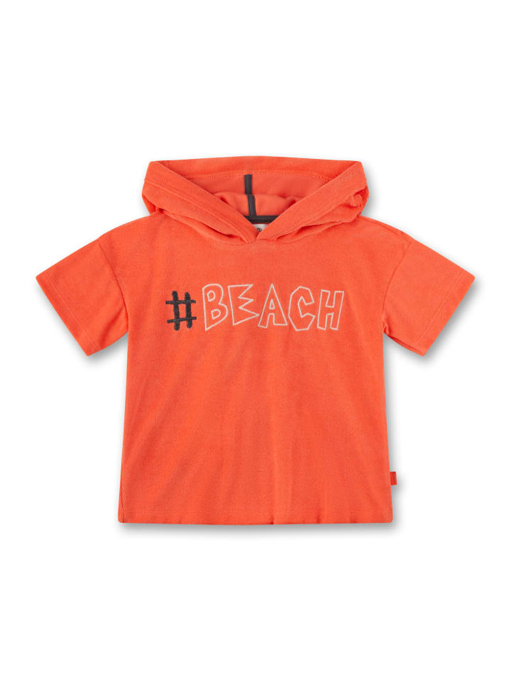 Фантастическая футболка с капюшоном для мальчиков от Sanetta Pure из красной махровой ткани с надписью #BEACH на груди.