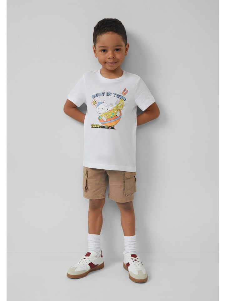 Футболка из начесаного хлопка с веселым принтом спереди для активных детей. Круглый вырез горловины с ребристым краем и короткие рукава обеспечивают комфорт во время игры. Классический крой обеспечивает свободу движений. Идеально подходит для повседневной носки или прогулок. Универсальная базовая вещь для гардероба любого ребенка.