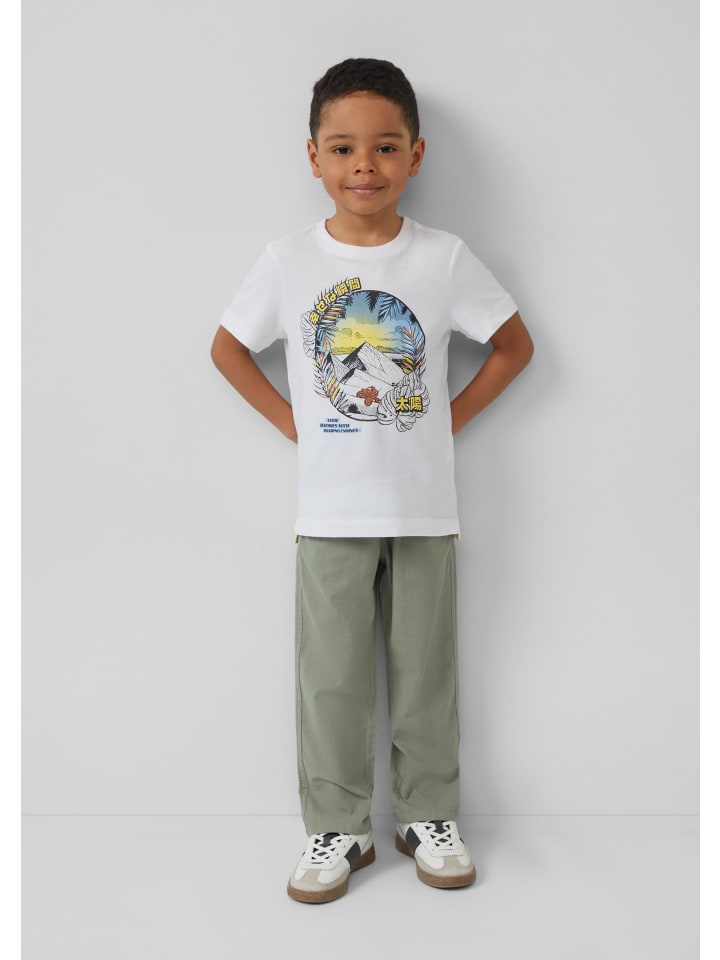 Универсальная футболка с принтом, круглым вырезом и разрезами по бокам. Трикотажная ткань обеспечивает комфортную носку для активных детей. Благодаря стильному принту спереди и сзади, футболка станет стильным спутником в школе и на отдыхе. Свободный крой обеспечивает свободу движений во время игр и пробежек.