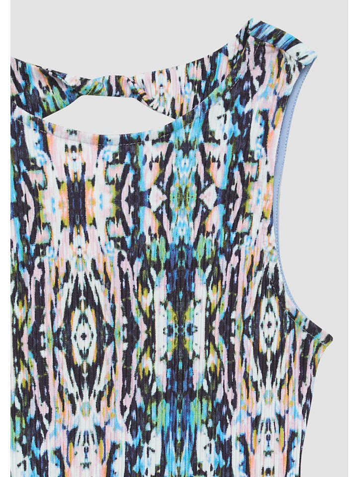 Эластичный топ в рубчик с модным вырезом и узлом. Широкие бретели и круглый вырез обеспечивают комфортную поддержку. Короткая длина и классический крой делают его универсальным летним спутником для вашего ребенка - как для игр, так и для особых случаев.